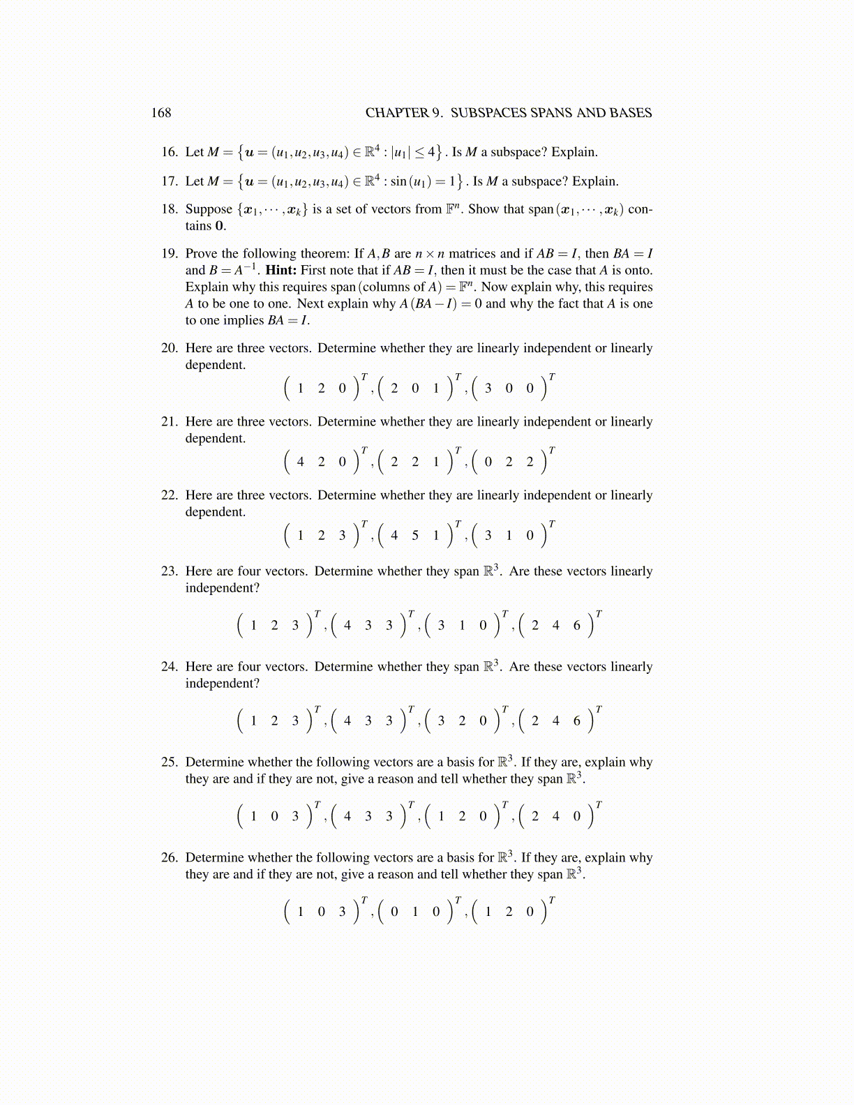 168 CHAPTER 9. SUBSPACES SPANS AND BASES