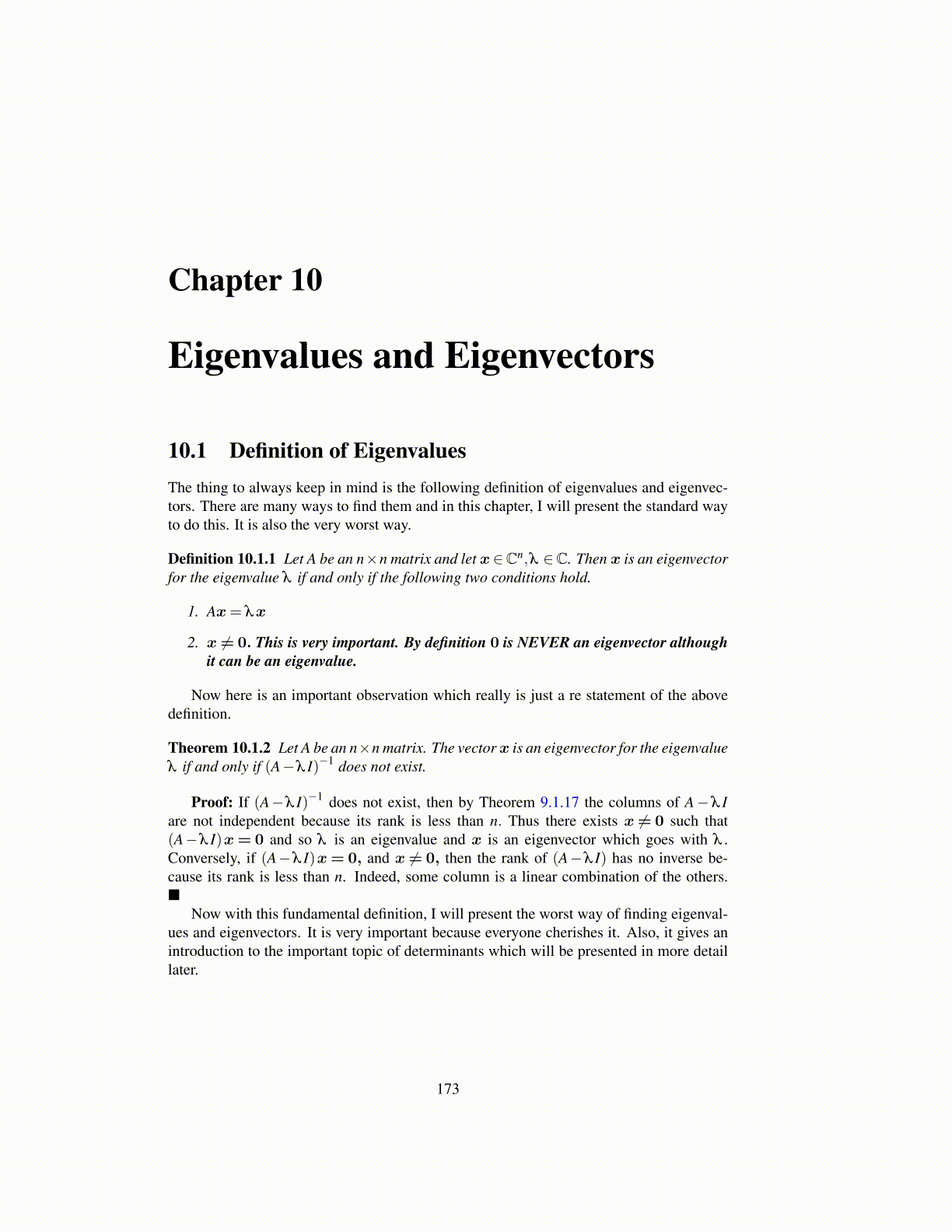 Definition 10.1.1 Let A be an n×n matrix and let x∈Cn,λ ∈C. Then x is an eigenvectorfor the eigenvalue λ if and only if the following two conditions hold.