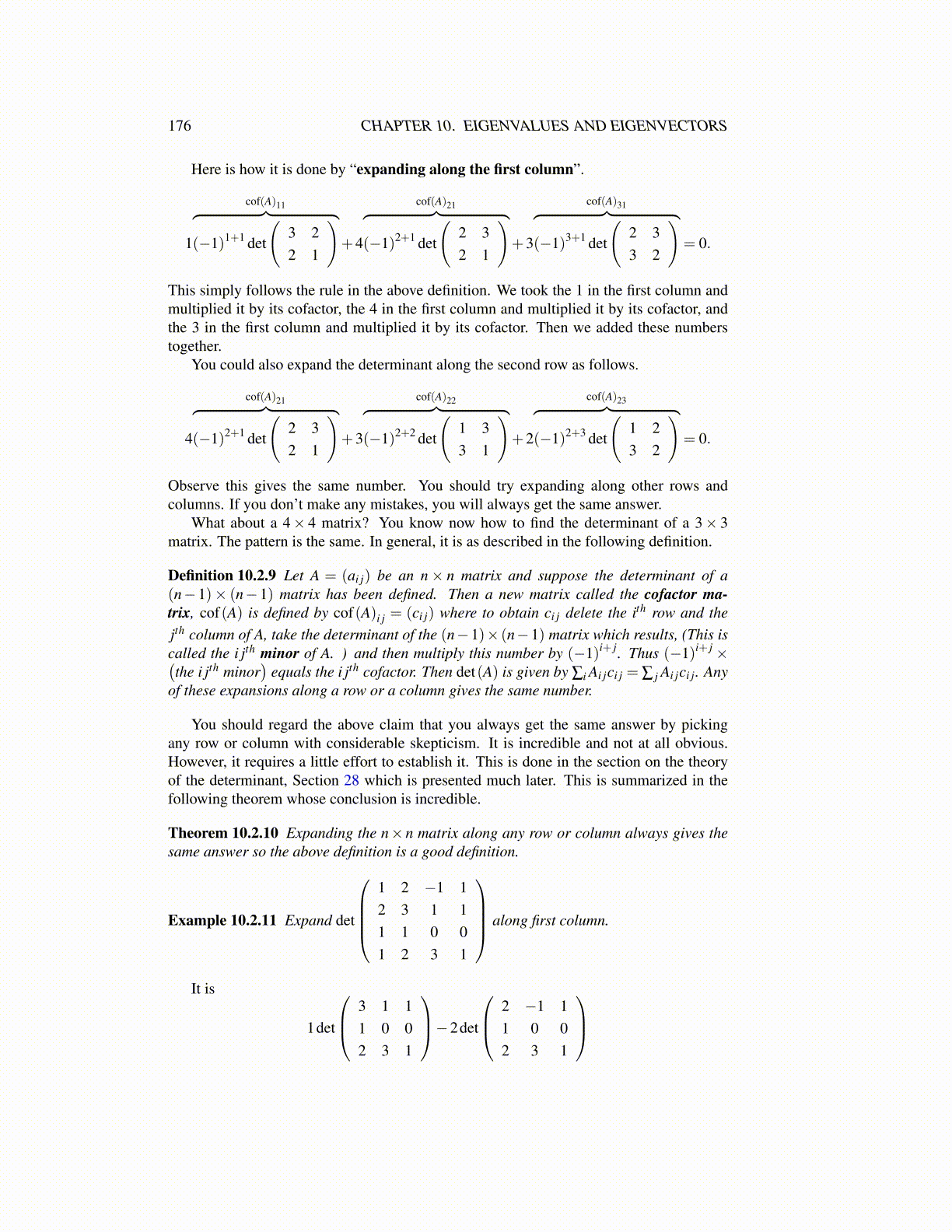 Definition 10.2.9 Let A = (ai j) be an n× n matrix and suppose the determinant of a(n−1)× (n−1) matrix has been defined. Then a new matrix called the cofactor ma-trix, cof(A) is defined by cof(A)i j = (ci j) where to obtain ci j delete the ith row and thejth column of A, take the determinant of the (n−1)× (n−1) matrix which results, (This iscalled the i jth minor of A. ) and then multiply this number by (−1)i+ j. Thus (−1)i+ j×(the i jth minor