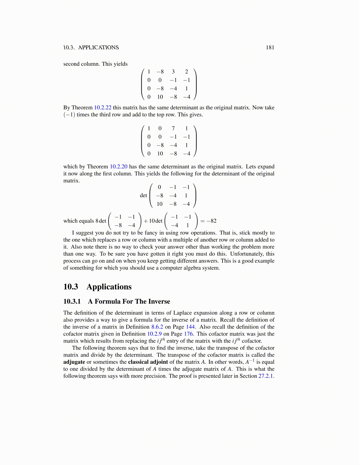 which by Theorem 10.2.20 has the same determinant as the original matrix. Lets expandit now along the first column. This yields the following for the determinant of the originalmatrix.