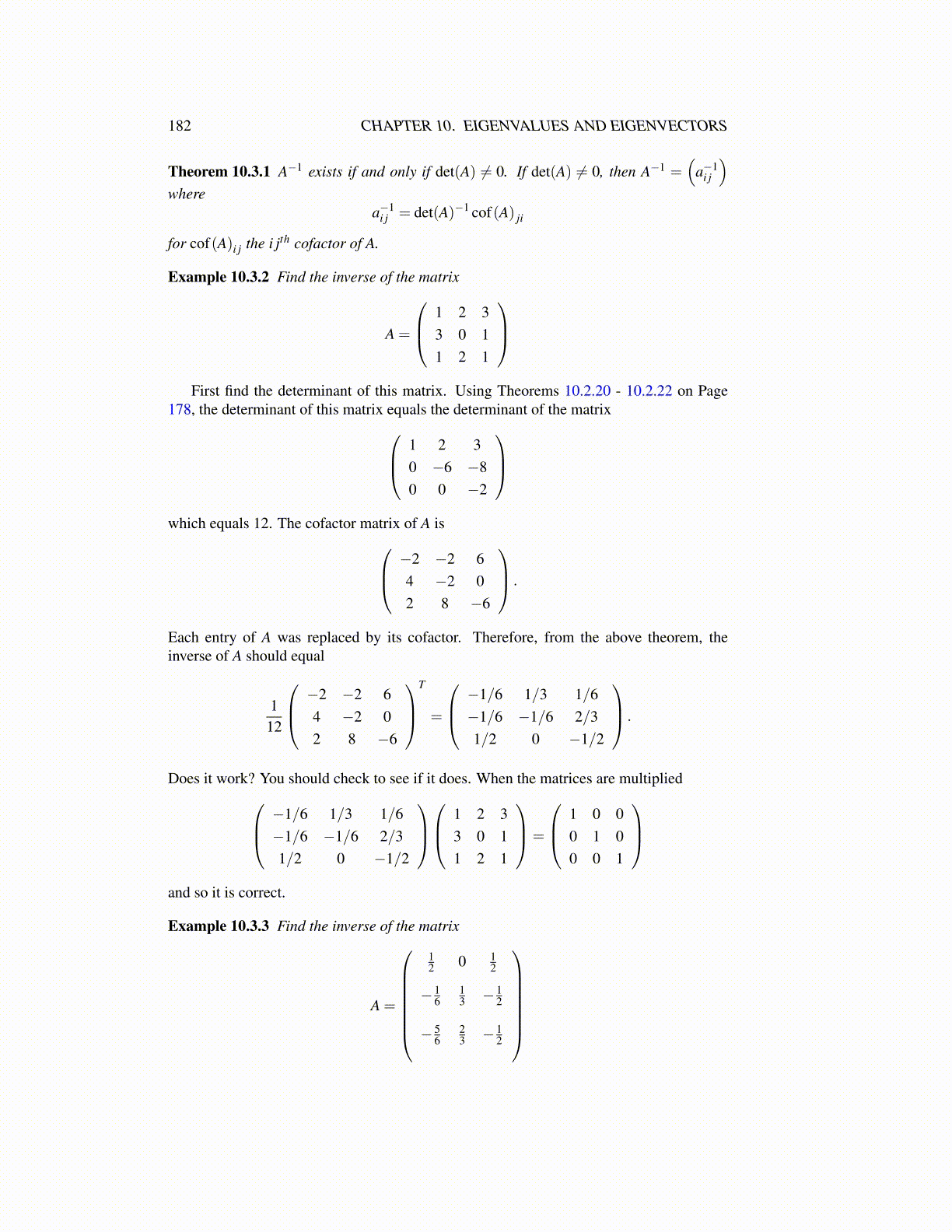 Theorem 10.3.1 A−1 exists if and only if det(A) ̸= 0. If det(A) ̸= 0, then A−1 =(