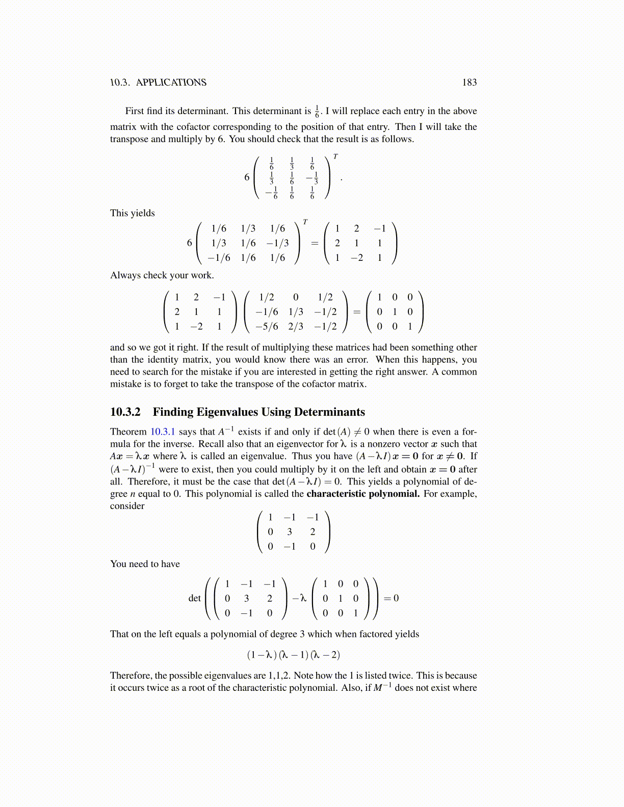 10.3.2 Finding Eigenvalues Using DeterminantsTheorem 10.3.1 says that A−1 exists if and only if det(A) ̸= 0 when there is even a for-mula for the inverse. Recall also that an eigenvector for λ is a nonzero vector x such thatAx = λx where λ is called an eigenvalue. Thus you have (A−λ I)x= 0 for x ̸= 0. If(A−λ I)−1 were to exist, then you could multiply by it on the left and obtain x= 0 afterall. Therefore, it must be the case that det(A−λ I) = 0. This yields a polynomial of de-gree n equal to 0. This polynomial is called the characteristic polynomial. For example,consider 1 −1 −1