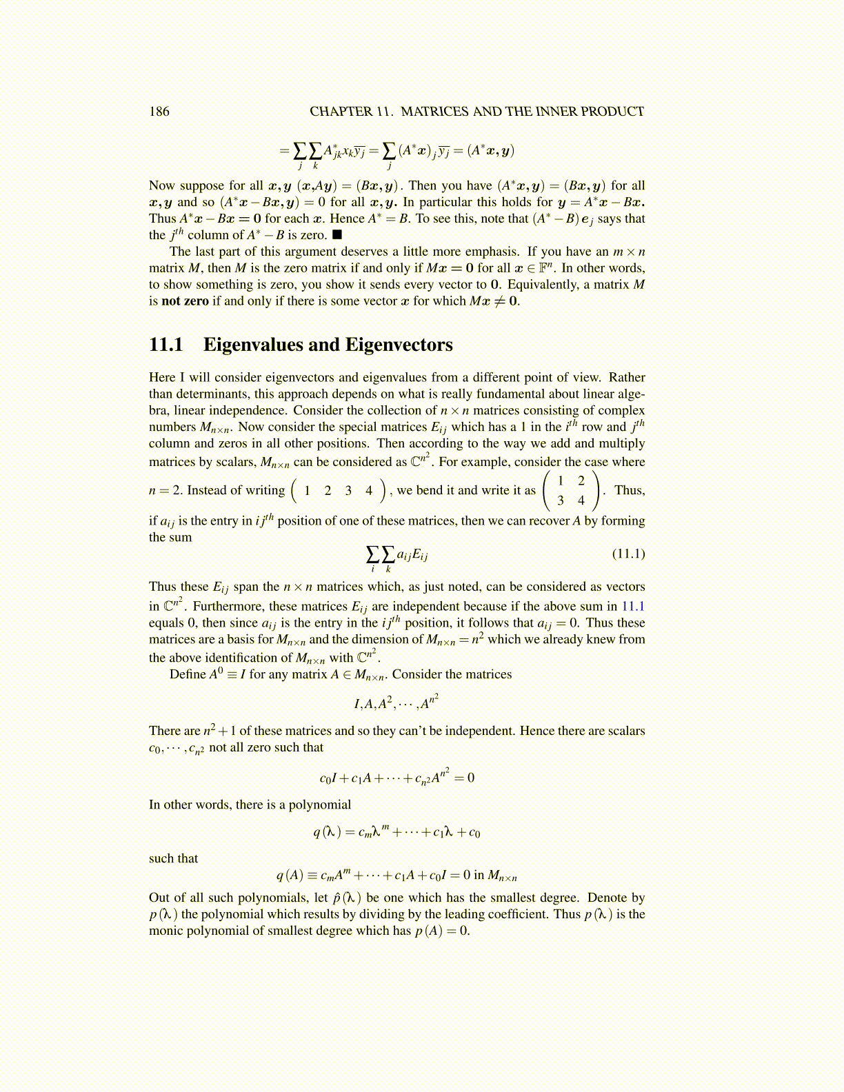 11.1 Eigenvalues and EigenvectorsHere I will consider eigenvectors and eigenvalues from a different point of view. Ratherthan determinants, this approach depends on what is really fundamental about linear alge-bra, linear independence. Consider the collection of n×n matrices consisting of complexnumbers Mn×n. Now consider the special matrices Ei j which has a 1 in the ith row and jth