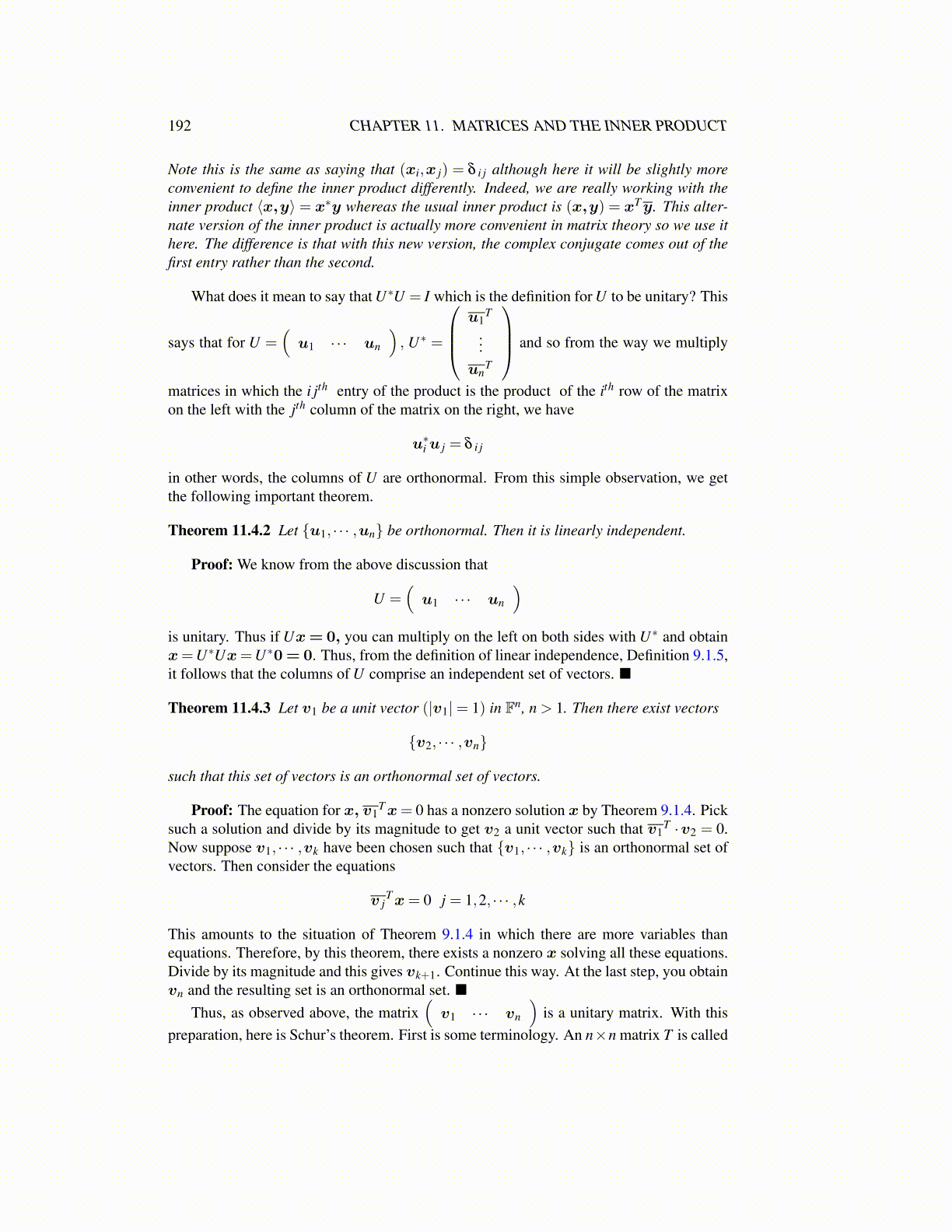 Theorem 11.4.2 Let {u1, · · · ,un} be orthonormal. Then it is linearly independent.
