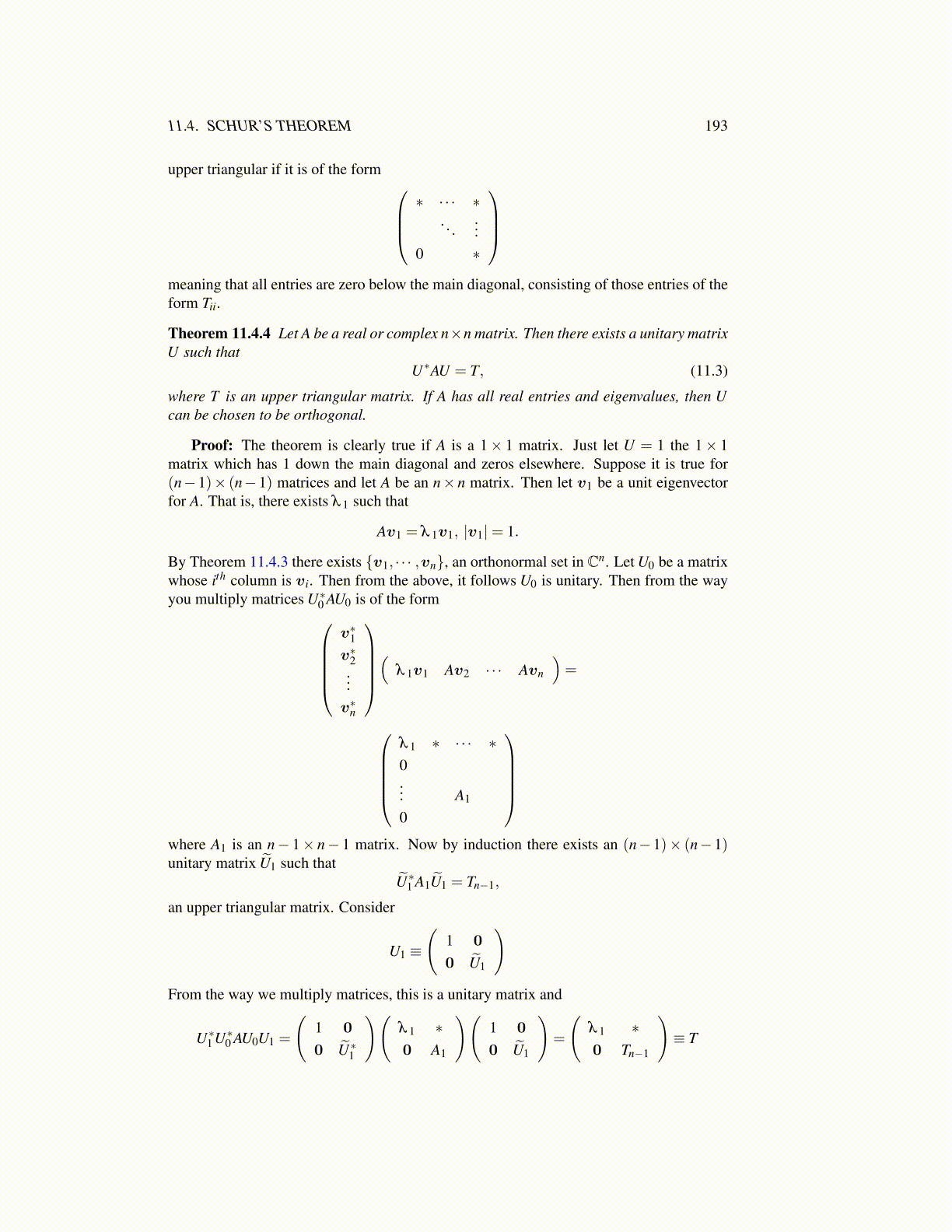 By Theorem 11.4.3 there exists {v1, · · · ,vn}, an orthonormal set in Cn. Let U0 be a matrixwhose ith column is vi. Then from the above, it follows U0 is unitary. Then from the wayyou multiply matrices U∗0 AU0 is of the form