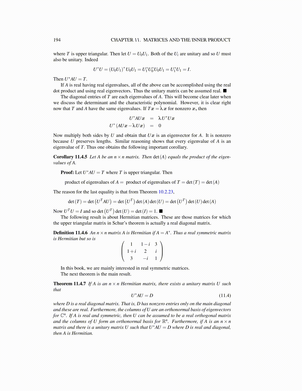 Theorem 11.4.7 If A is an n× n Hermitian matrix, there exists a unitary matrix U suchthat