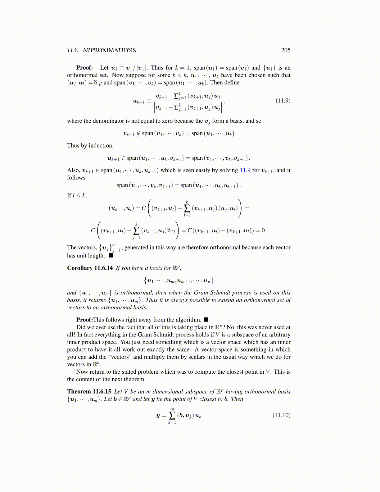 Proof: Let u1 ≡ v1/ |v1| . Thus for k = 1, span(u1) = span(v1) and {u1} is anorthonormal set. Now suppose for some k < n, u1, · · · , uk have been chosen such that(u j,ul) = δ jl and span(v1, · · · ,vk) = span(u1, · · · ,uk). Then define