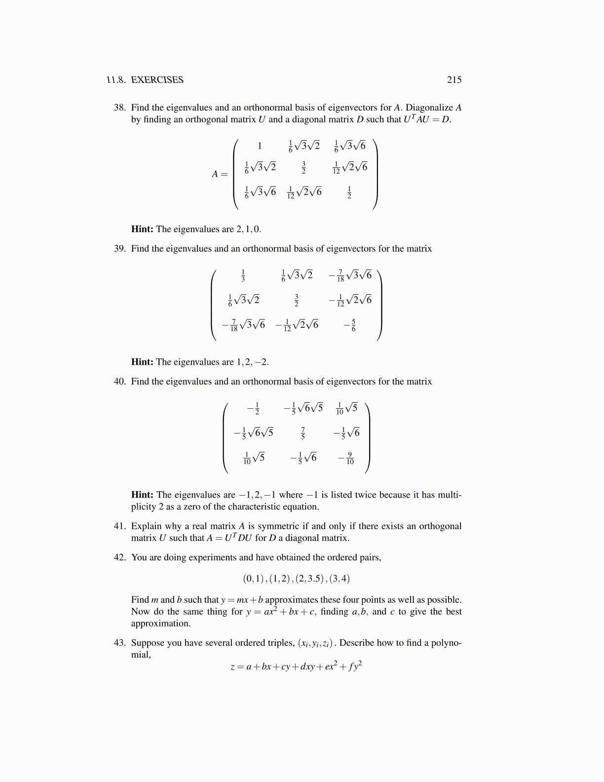 39. Find the eigenvalues and an orthonormal basis of eigenvectors for the matrix