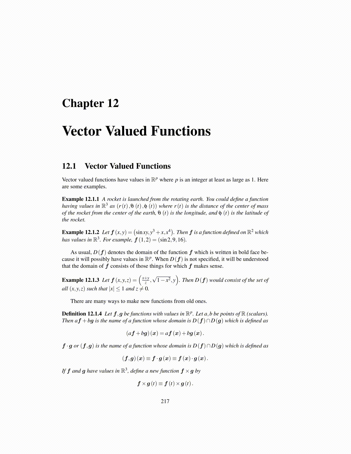 Definition 12.1.4 Let f ,g be functions with values in Rp. Let a,b be points of R (scalars).Then af +bg is the name of a function whose domain is D(f)∩D(g) which is defined as