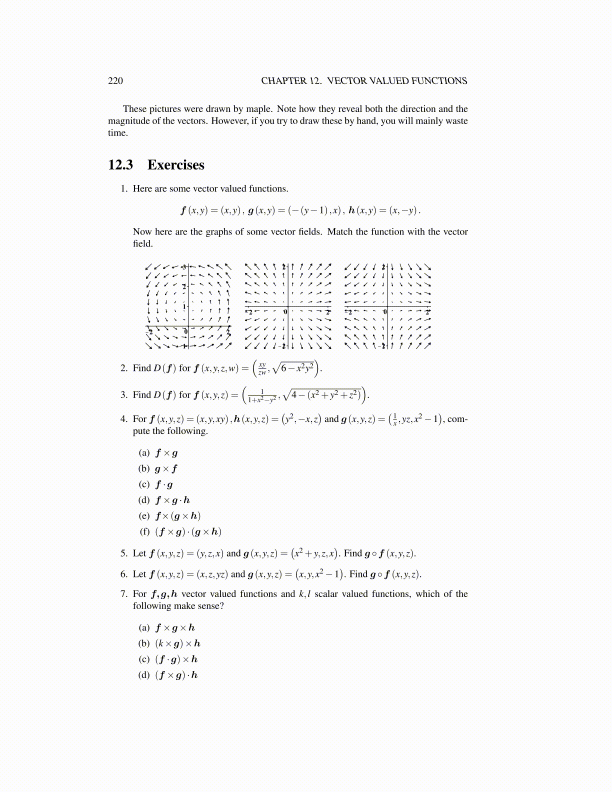 220 CHAPTER 12. VECTOR VALUED FUNCTIONSThese pictures were drawn by maple. Note how they reveal both the direction and themagnitude of the vectors. However, if you try to draw these by hand, you will mainly wastetime.12.3. Exercises1. Here are some vector valued functions.Ff (x,y) = (x,y), g(x,y) = (— (y— 1),x), h(x,y) = (x, —y).Now here are the graphs of some vector fields. Match the function with the vectorfield.kw BAN NNKOORRAN A BE PA AA ex LL BNVSNNN™SLfeer |= NANNA TP PAZ AAZ Moo LAITY NY NN™Li fe gir nNNAA WRN A UD AAA ww £ £dI|YNNN™Ll feels nn qr fr a a aa a ee eee ee ele wnsa a > oe || > ela | iVY NSN t]- 4 74 7 f ware ve ELAN NN Sni nn eee wee LS LIV NNN RANA AT TZ AANNN ole 44 A CL LLIAIVNNNN NANA TTF AAZAANe ee AF SSL L-RNNNNN NANA ART PT AAA: xy2. Find D(f) for f (x,y.z,) = (2, 6—37)?).3. Find D(f) for f (x,9,2) = (Gage. V4- (+P +2).4. For f (x,y,z) = (x,y,xy) 2 (x,y,z) = (y*, —x,z) and g (x,y,z) = (4,9z,27 — 1), com-pute the following.(a) fxg(b) 9x f(c) f-g(d) fxg:h(e) fx(gxh)(f) (f xg)-(gxh)5. Let f (x,y,z) = (y,z,x) and g (x,y,z) = (x7 +y,z,x). Find go f (x,y,z).6. Let f (x,y,z) = (x,z,yz) and g (x,y,z) = (x,y,x? — 1). Find go f (x,y,z).7. For f,g,h vector valued functions and k,/ scalar valued functions, which of thefollowing make sense?(a) fxgxh(b) (kxg)xh(c) (f-g)xh(d) (f xg)-h