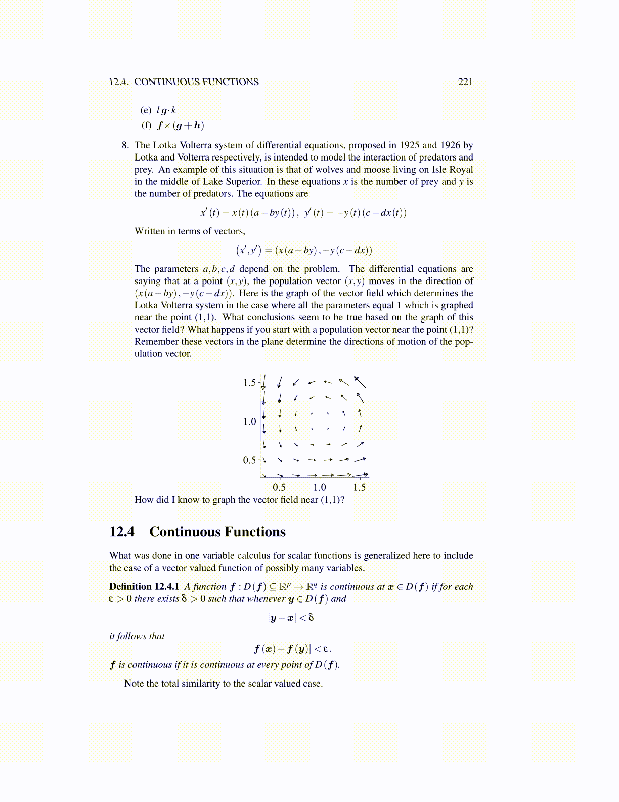 12.4 Continuous FunctionsWhat was done in one variable calculus for scalar functions is generalized here to includethe case of a vector valued function of possibly many variables.
