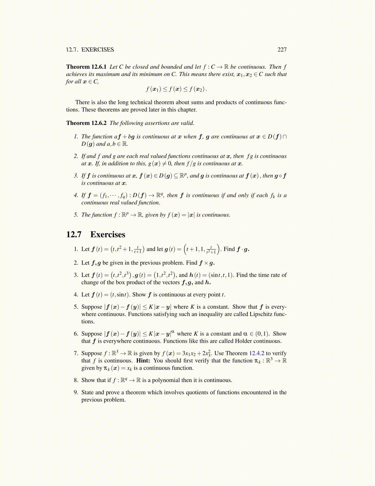 Theorem 12.6.1 Let C be closed and bounded and let f : C→ R be continuous. Then fachieves its maximum and its minimum on C. This means there exist, x1,x2 ∈C such thatfor all x ∈C,