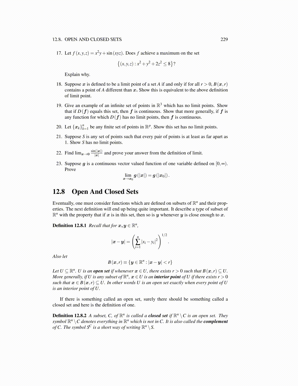 12.8 Open And Closed SetsEventually, one must consider functions which are defined on subsets of Rn and their prop-erties. The next definition will end up being quite important. It describe a type of subset ofRn with the property that if x is in this set, then so is y whenever y is close enough to x.
