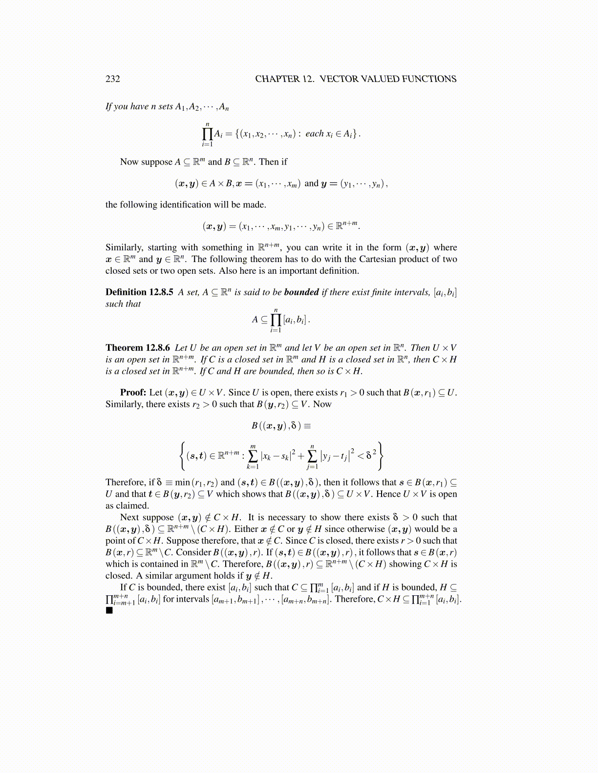 Theorem 12.8.6 Let U be an open set in Rm and let V be an open set in Rn. Then U ×Vis an open set in Rn+m. If C is a closed set in Rm and H is a closed set in Rn, then C×His a closed set in Rn+m. If C and H are bounded, then so is C×H.