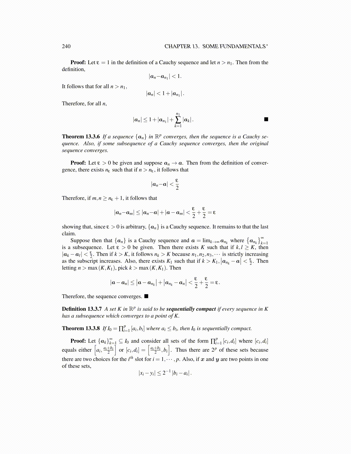 Theorem 13.3.6 If a sequence {an} in Rp converges, then the sequence is a Cauchy se-quence. Also, if some subsequence of a Cauchy sequence converges, then the originalsequence converges.