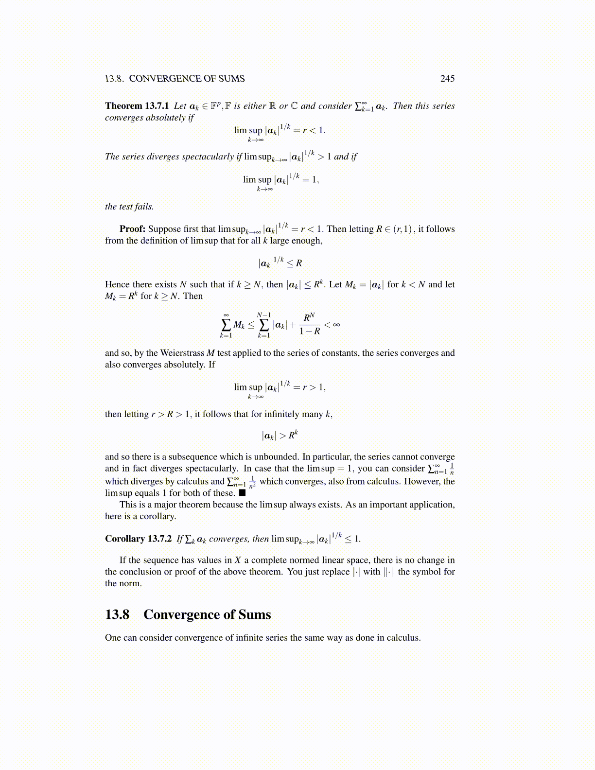Corollary 13.7.2 If ∑k ak converges, then limsupk→∞ |ak|1/k ≤ 1.