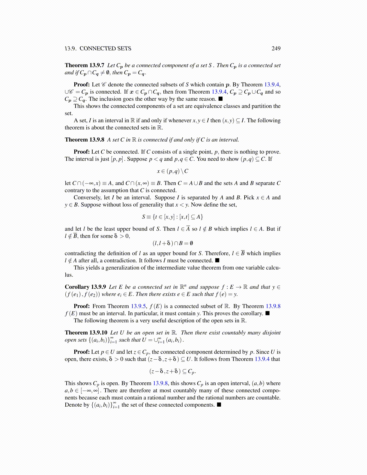 Theorem 13.9.7 Let Cp be a connected component of a set S . Then Cp is a connected setand if Cp∩Cq ̸= /0, then Cp =Cq.