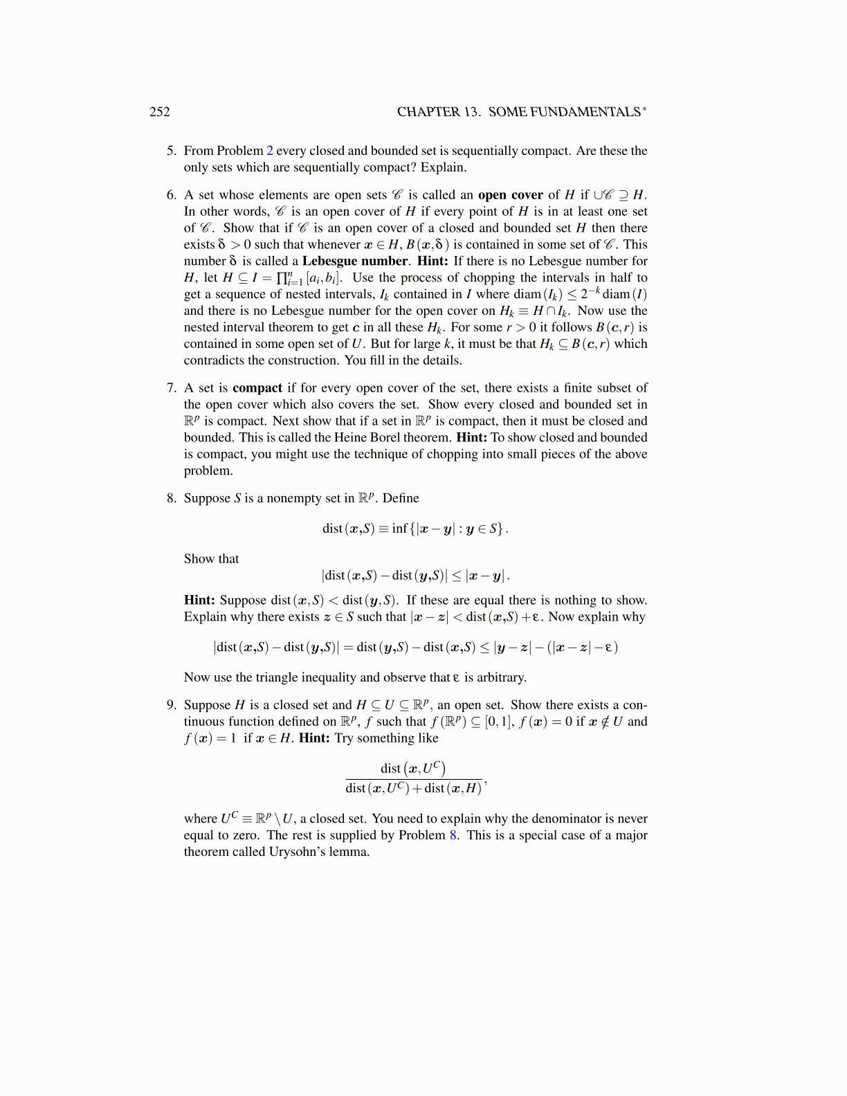 7. A set is compact if for every open cover of the set, there exists a finite subset ofthe open cover which also covers the set. Show every closed and bounded set inRp is compact. Next show that if a set in Rp is compact, then it must be closed andbounded. This is called the Heine Borel theorem. Hint: To show closed and boundedis compact, you might use the technique of chopping into small pieces of the aboveproblem.