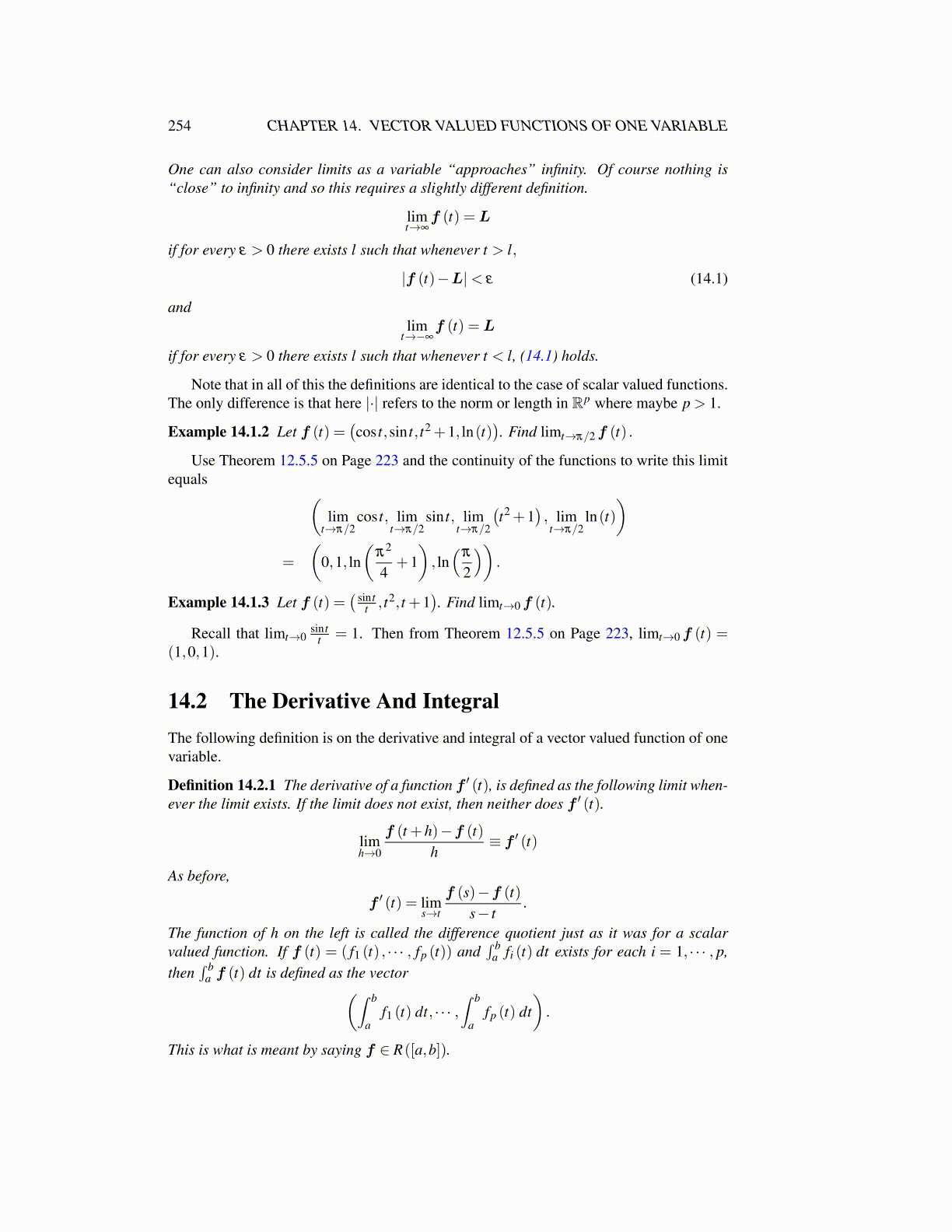 14.2 The Derivative And IntegralThe following definition is on the derivative and integral of a vector valued function of onevariable.