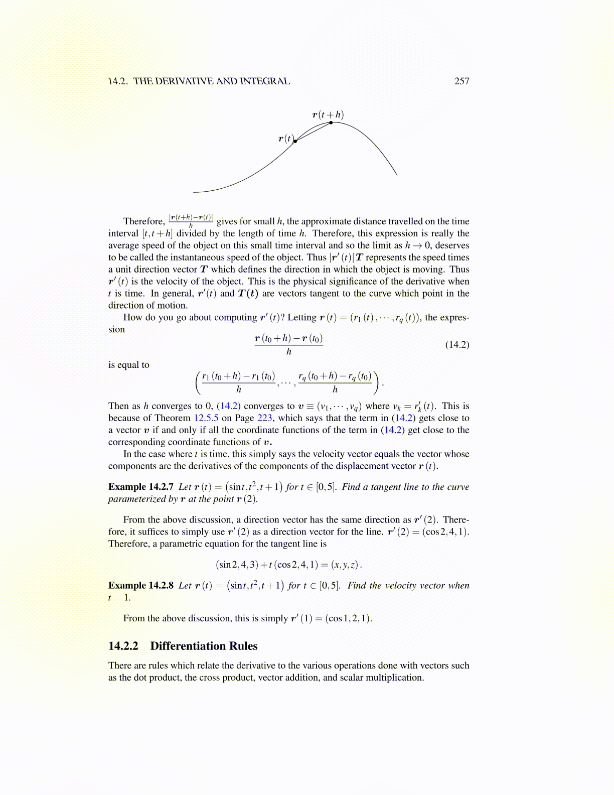 Then as h converges to 0, (14.2) converges to v ≡ (v1, · · · ,vq) where vk = r′k (t). This isbecause of Theorem 12.5.5 on Page 223, which says that the term in (14.2) gets close toa vector v if and only if all the coordinate functions of the term in (14.2) get close to thecorresponding coordinate functions of v.