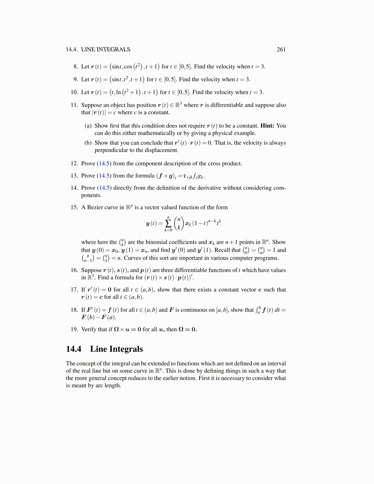 14.4 Line IntegralsThe concept of the integral can be extended to functions which are not defined on an intervalof the real line but on some curve in Rn. This is done by defining things in such a way thatthe more general concept reduces to the earlier notion. First it is necessary to consider whatis meant by arc length.