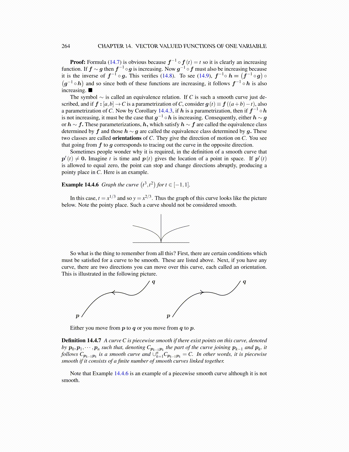 The symbol ∼ is called an equivalence relation. If C is such a smooth curve just de-scribed, and if f : [a,b]→C is a parametrization of C, consider g (t)≡ f ((a+b)− t), alsoa parametrization of C. Now by Corollary 14.4.3, if h is a parametrization, then if f−1 ◦his not increasing, it must be the case that g−1 ◦h is increasing. Consequently, either h∼ gor h∼ f. These parameterizations, h, which satisfy h∼ f are called the equivalence classdetermined by f and those h∼ g are called the equivalence class determined by g. Thesetwo classes are called orientations of C. They give the direction of motion on C. You seethat going from f to g corresponds to tracing out the curve in the opposite direction.