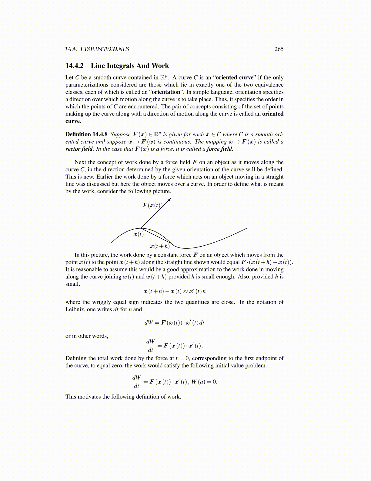 Definition 14.4.8 Suppose F (x) ∈ Rp is given for each x ∈ C where C is a smooth ori-ented curve and suppose x→ F (x) is continuous. The mapping x→ F (x) is called avector field. In the case that F (x) is a force, it is called a force field.