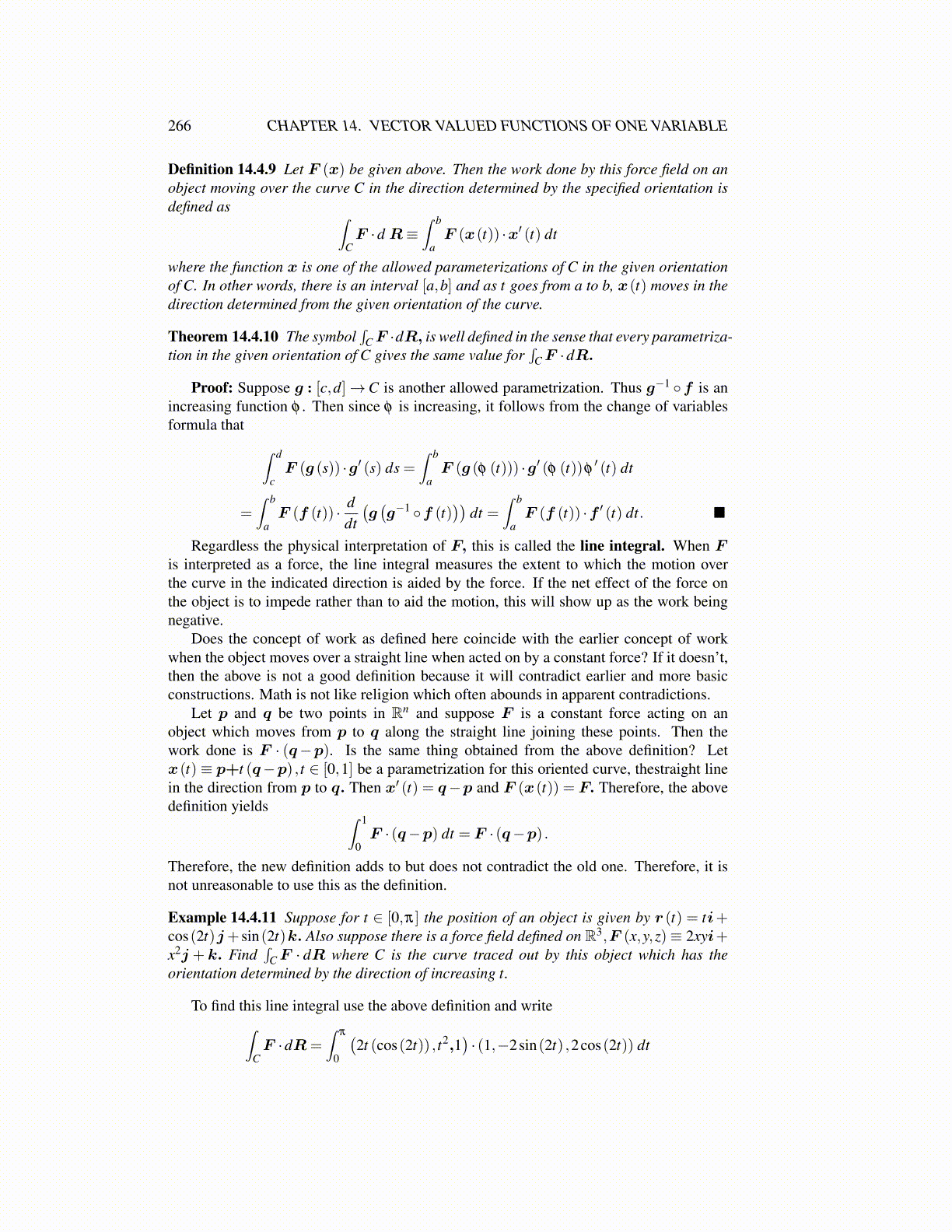 Definition 14.4.9 Let F (x) be given above. Then the work done by this force field on anobject moving over the curve C in the direction determined by the specified orientation isdefined as ∫