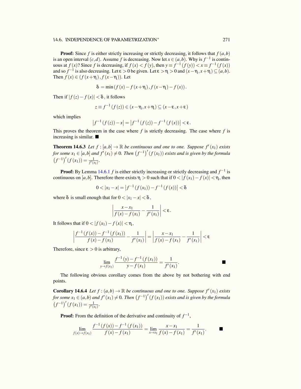 Proof: By Lemma 14.6.1 f is either strictly increasing or strictly decreasing and f−1 iscontinuous on [a,b]. Therefore there exists η > 0 such that if 0 < | f (x1)− f (x)|< η , then