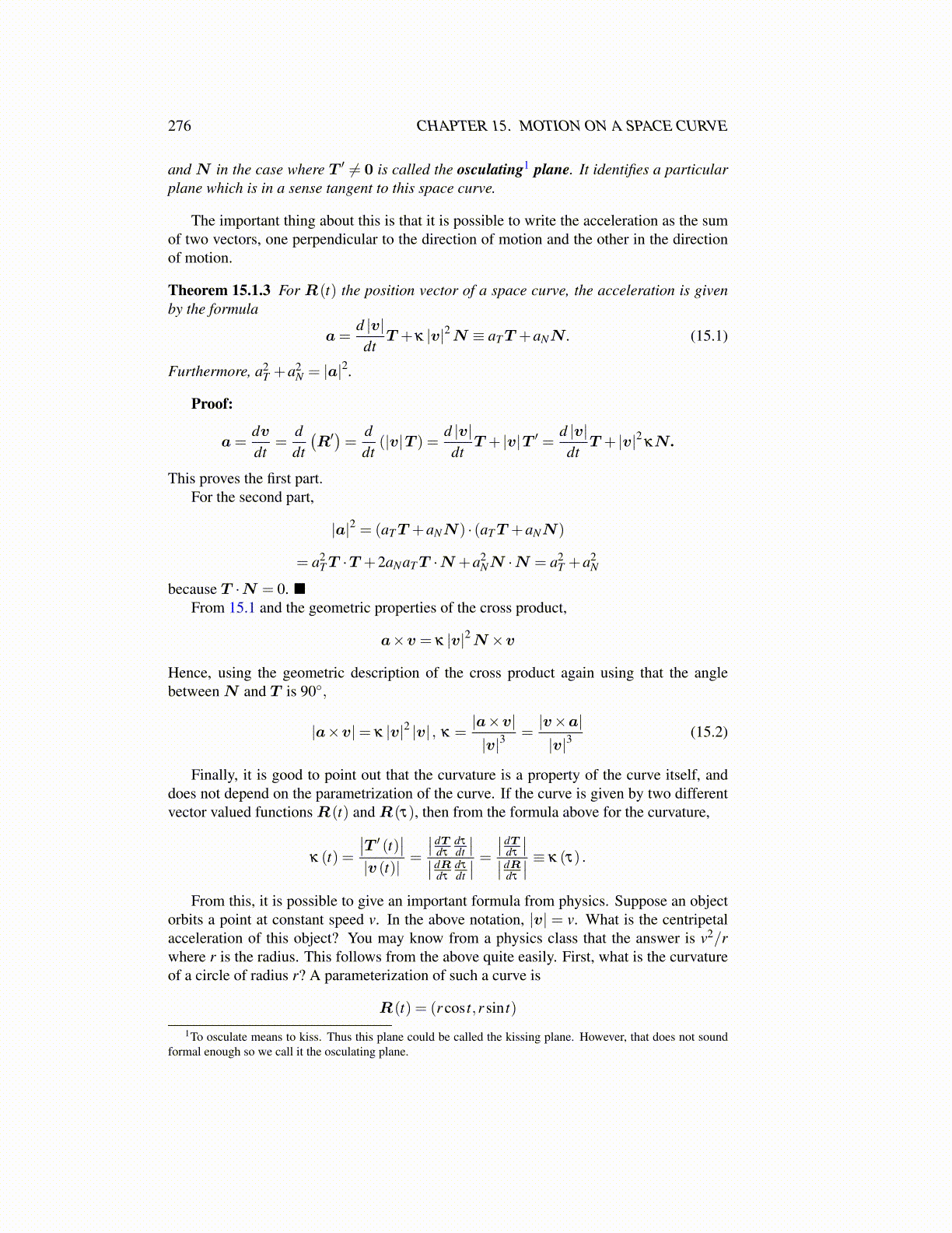 From this, it is possible to give an important formula from physics. Suppose an objectorbits a point at constant speed v. In the above notation, |v| = v. What is the centripetalacceleration of this object? You may know from a physics class that the answer is v2/rwhere r is the radius. This follows from the above quite easily. First, what is the curvatureof a circle of radius r? A parameterization of such a curve is