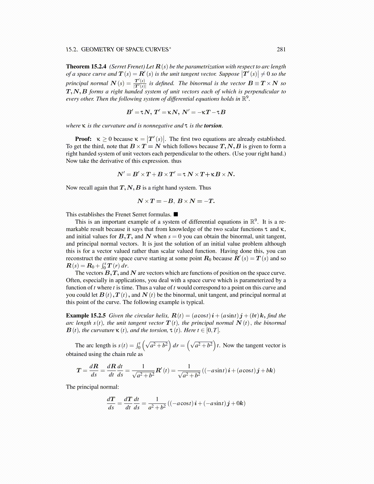 Theorem 15.2.4 (Serret Frenet) Let R(s) be the parametrization with respect to arc lengthof a space curve and T (s) =R′ (s) is the unit tangent vector. Suppose