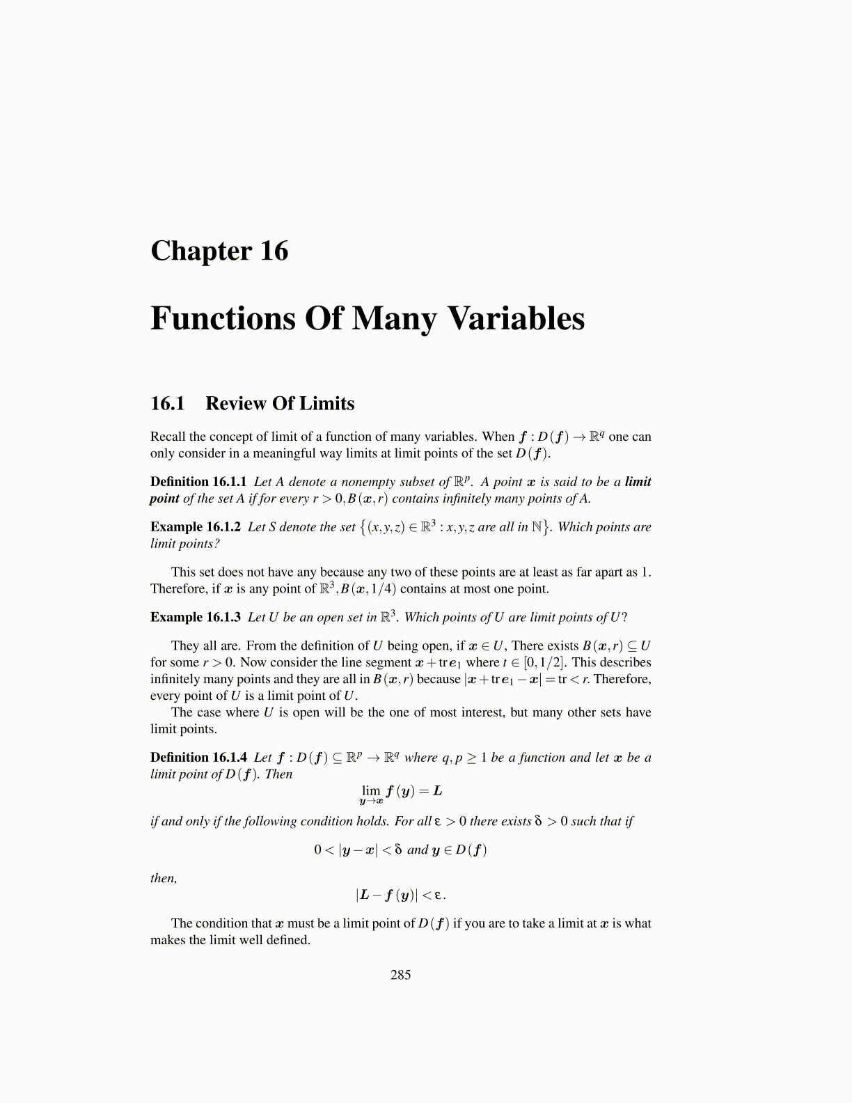 16.1 Review Of LimitsRecall the concept of limit of a function of many variables. When f : D(f)→ Rq one canonly consider in a meaningful way limits at limit points of the set D(f).