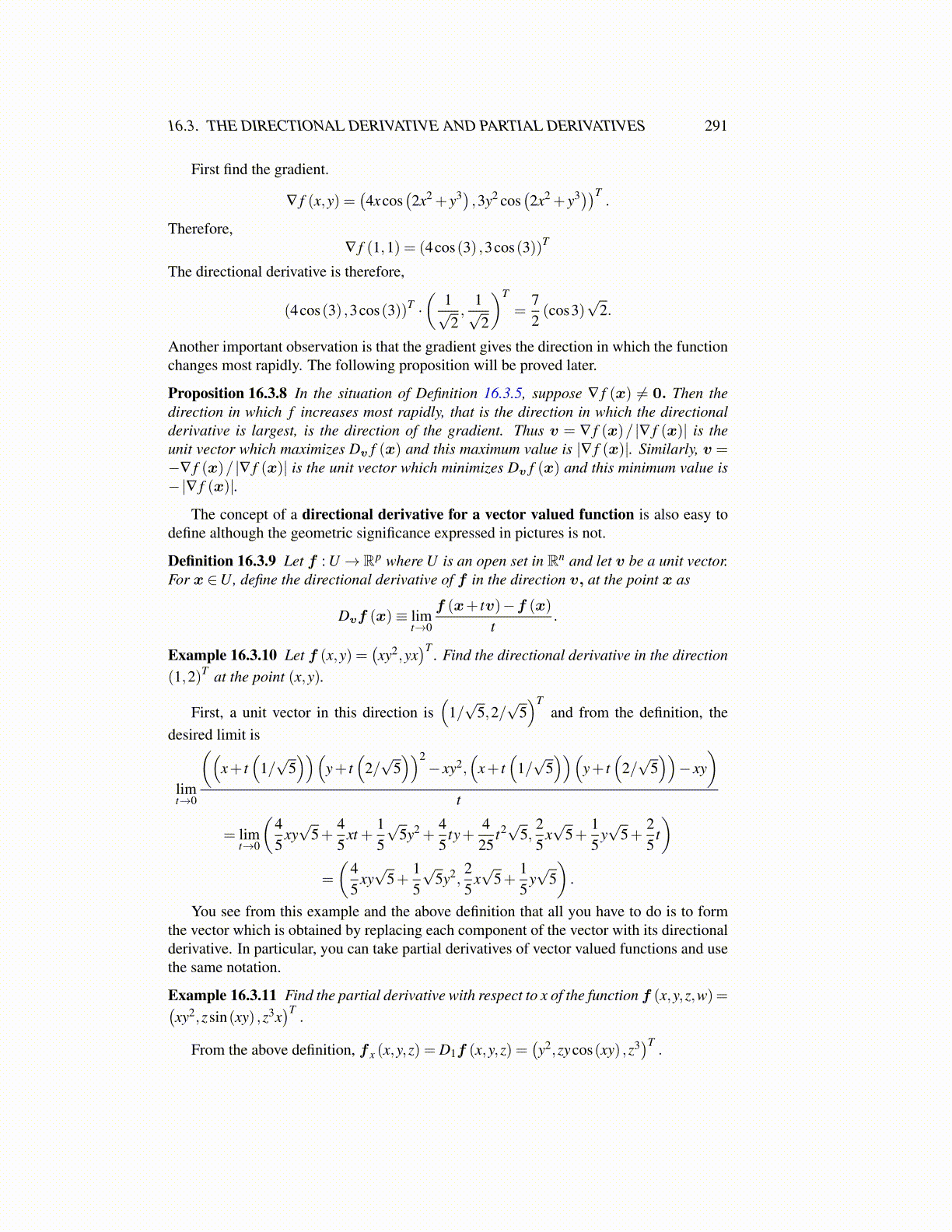 Proposition 16.3.8 In the situation of Definition 16.3.5, suppose ∇ f (x) ΜΈ= 0. Then thedirection in which f increases most rapidly, that is the direction in which the directionalderivative is largest, is the direction of the gradient. Thus v = ∇ f (x)/ |∇ f (x)| is theunit vector which maximizes Dv f (x) and this maximum value is |∇ f (x)|. Similarly, v =−∇ f (x)/ |∇ f (x)| is the unit vector which minimizes Dv f (x) and this minimum value is−|∇ f (x)|.