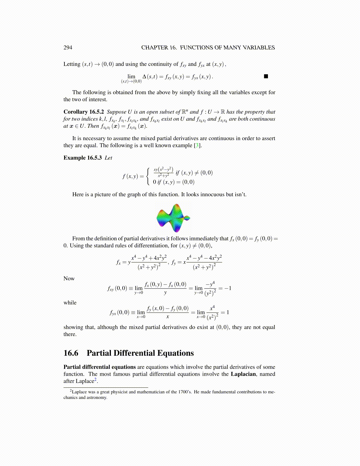 Corollary 16.5.2 Suppose U is an open subset of Rn and f : U → R has the property thatfor two indices k, l, fxk , fxl , fxlxk , and fxkxl exist on U and fxkxl and fxlxk are both continuousat x ∈U. Then fxkxl (x) = fxlxk (x).