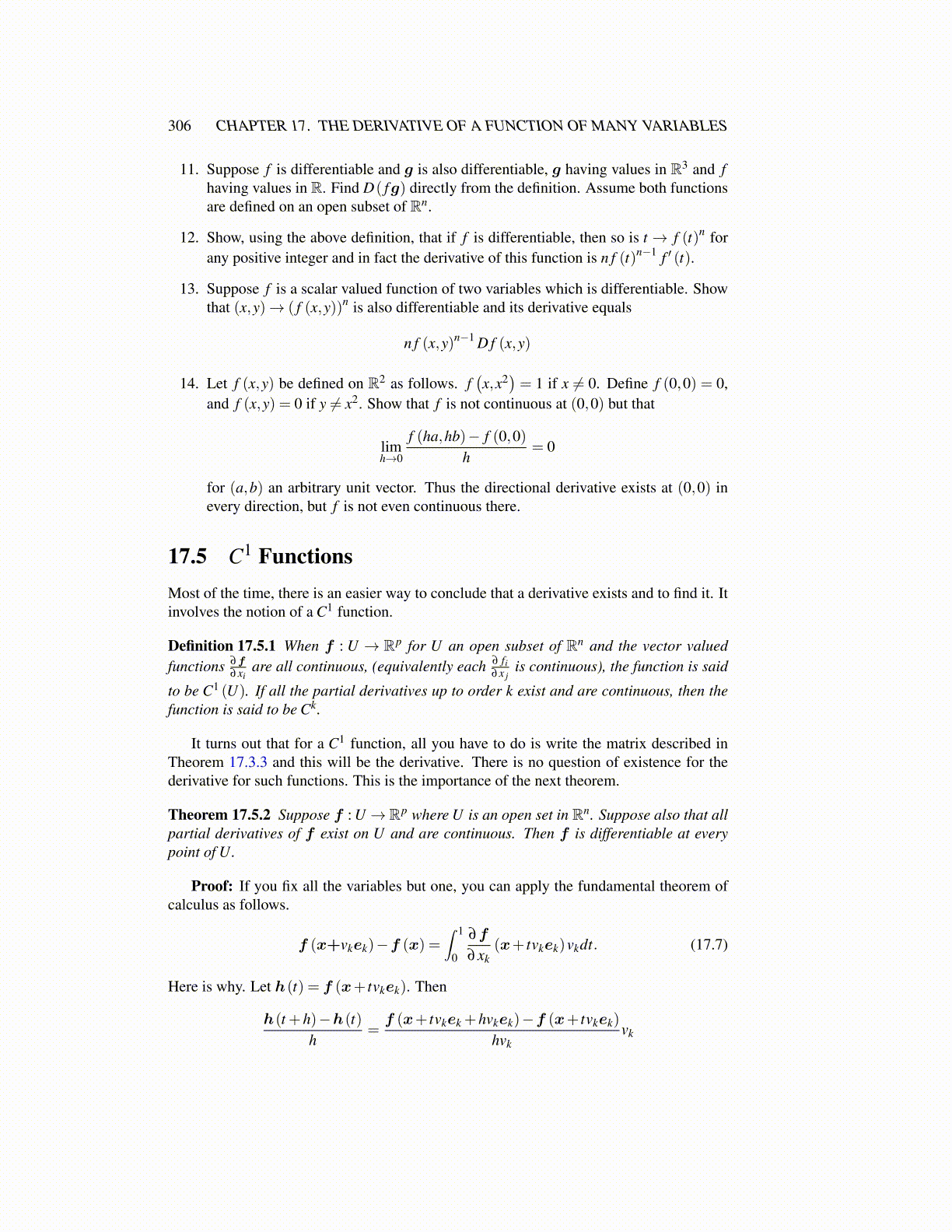 Theorem 17.5.2 Suppose f : U →Rp where U is an open set in Rn. Suppose also that allpartial derivatives of f exist on U and are continuous. Then f is differentiable at everypoint of U.
