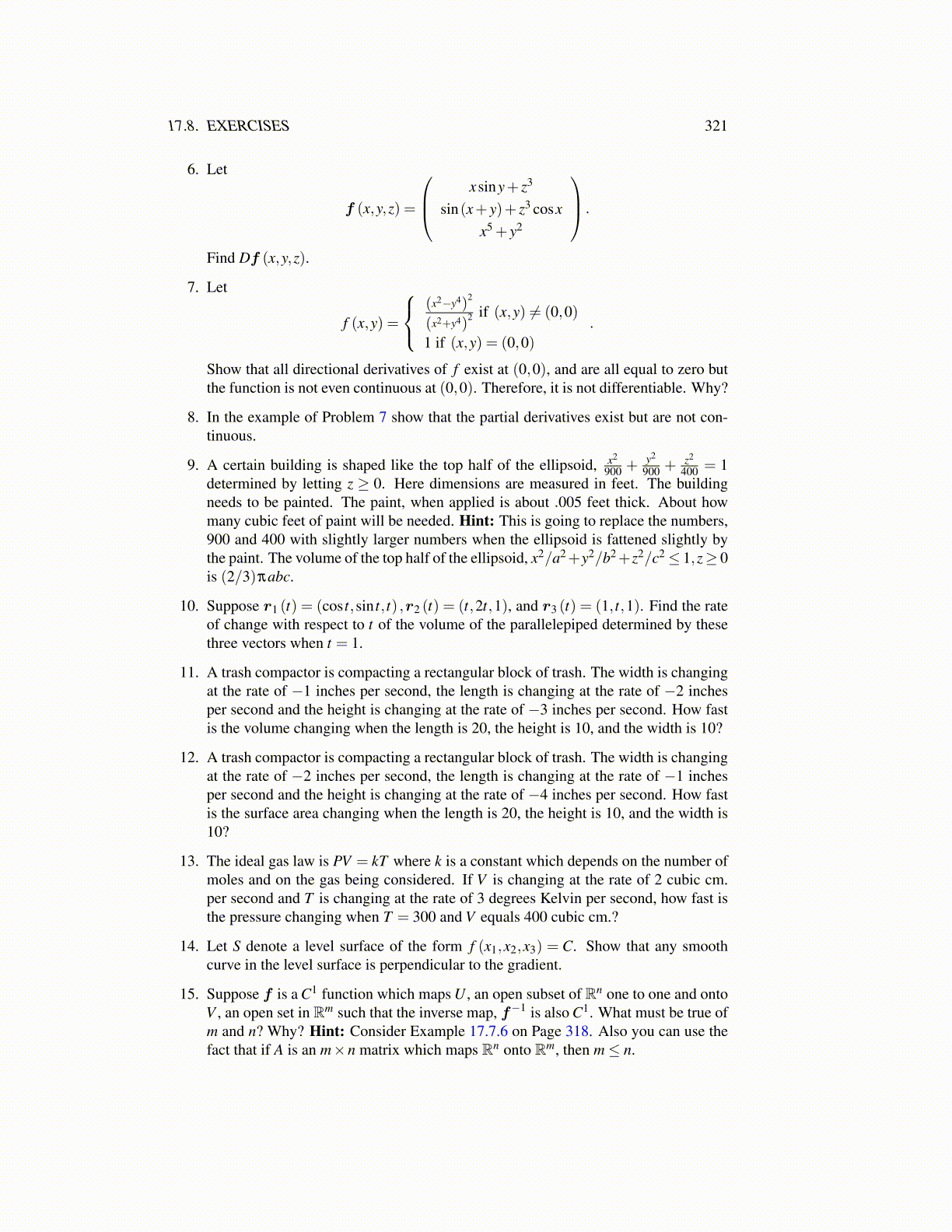 15. Suppose f is a C1 function which maps U , an open subset of Rn one to one and ontoV , an open set in Rm such that the inverse map, f−1 is also C1. What must be true ofm and n? Why? Hint: Consider Example 17.7.6 on Page 318. Also you can use thefact that if A is an m×n matrix which maps Rn onto Rm, then m≤ n.