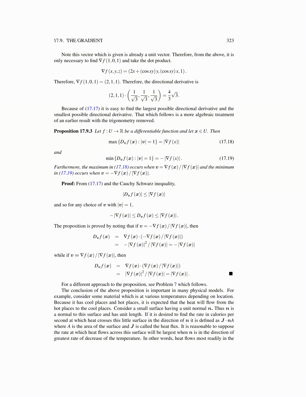 Furthermore, the maximum in (17.18) occurs when v=∇ f (x)/ |∇ f (x)| and the minimumin (17.19) occurs when v =−∇ f (x)/ |∇ f (x)|.