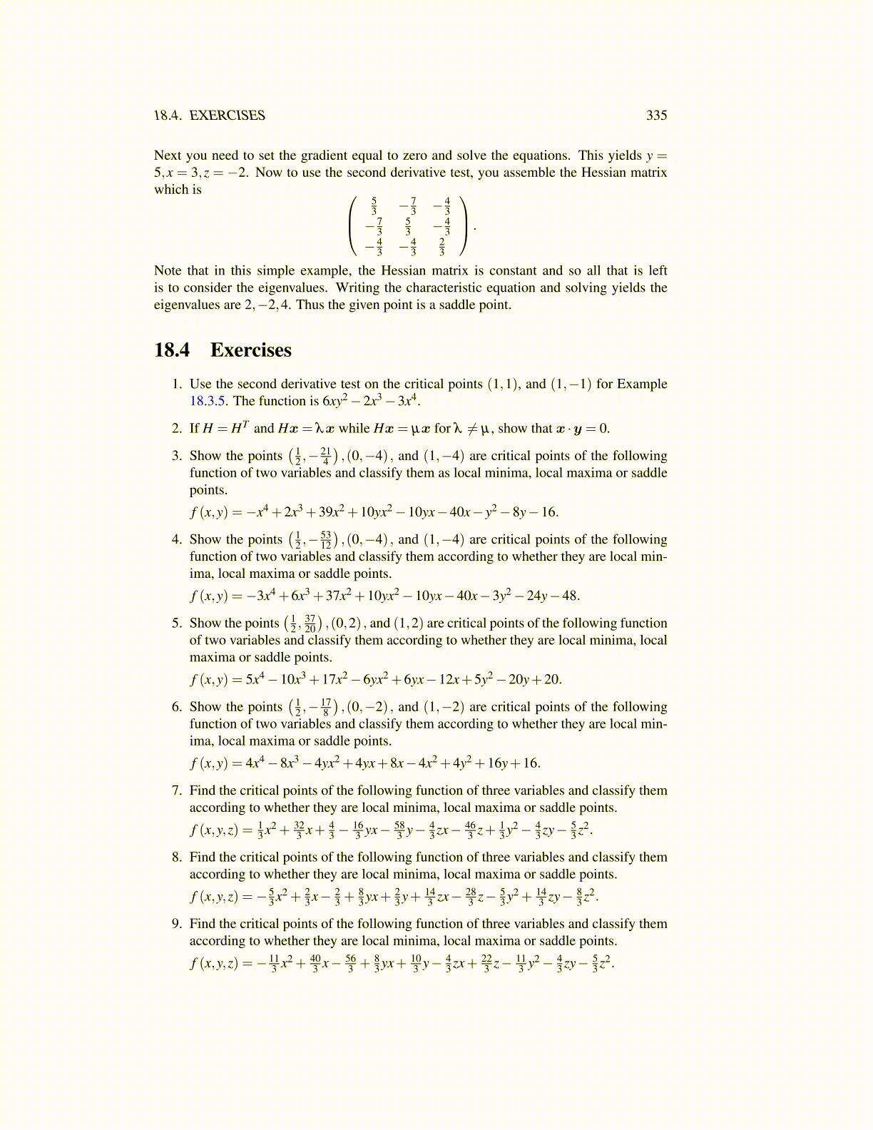 Note that in this simple example, the Hessian matrix is constant and so all that is leftis to consider the eigenvalues. Writing the characteristic equation and solving yields theeigenvalues are 2,−2,4. Thus the given point is a saddle point.