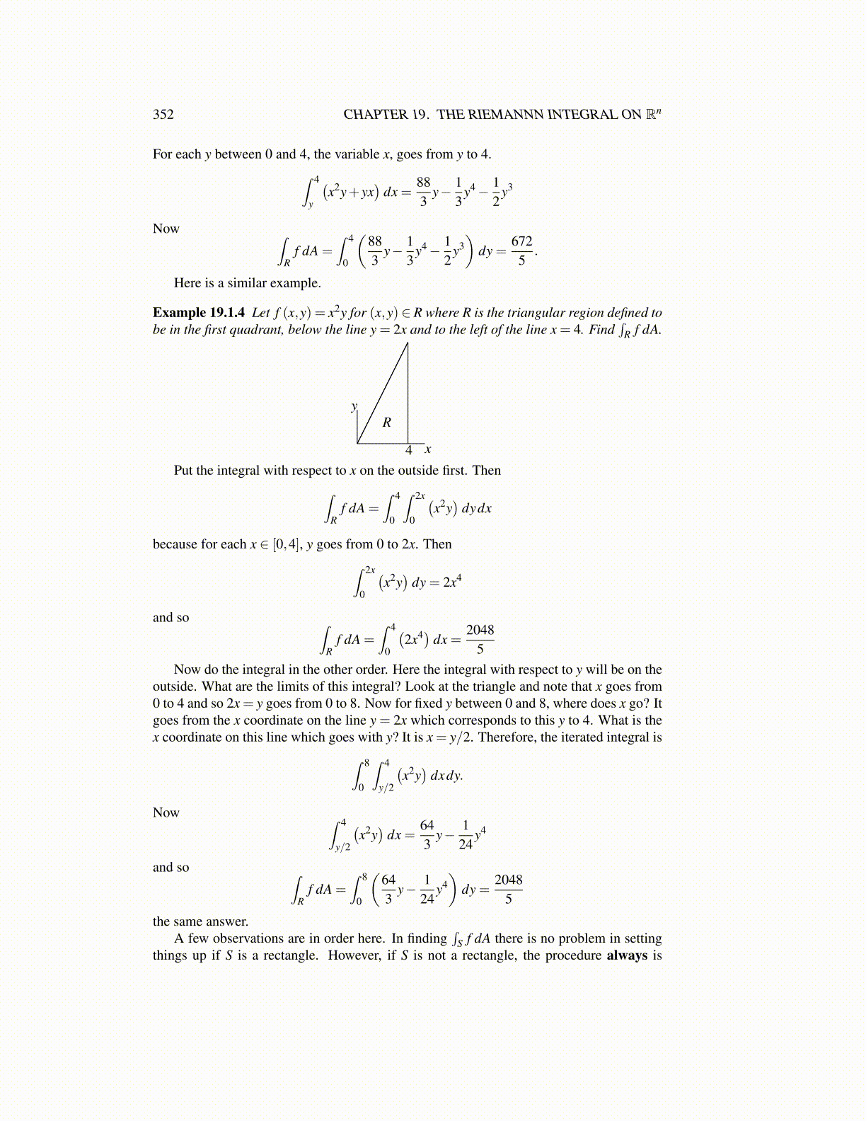 Example 19.1.4 Let f (x,y) = x2y for (x,y)∈ R where R is the triangular region defined tobe in the first quadrant, below the line y = 2x and to the left of the line x = 4. Find