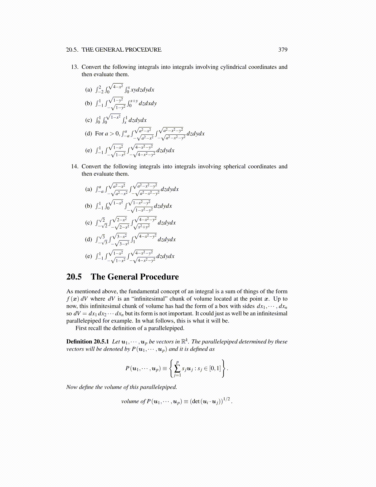 Definition 20.5.1 Let u1, · · · ,up be vectors in Rk. The parallelepiped determined by thesevectors will be denoted by P(u1, · · · ,up) and it is defined as