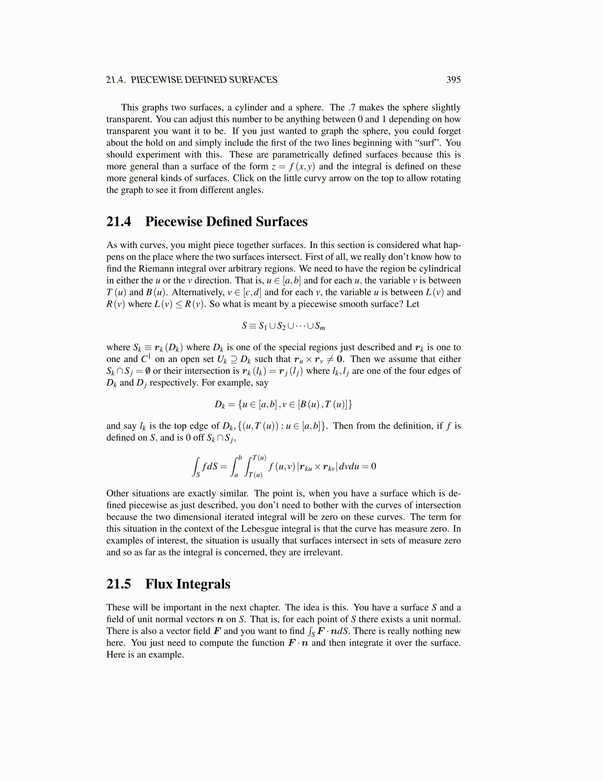 21.4 Piecewise Defined SurfacesAs with curves, you might piece together surfaces. In this section is considered what hap-pens on the place where the two surfaces intersect. First of all, we really don’t know how tofind the Riemann integral over arbitrary regions. We need to have the region be cylindricalin either the u or the v direction. That is, u ∈ [a,b] and for each u, the variable v is betweenT (u) and B(u). Alternatively, v ∈ [c,d] and for each v, the variable u is between L(v) andR(v) where L(v)≤ R(v). So what is meant by a piecewise smooth surface? Let