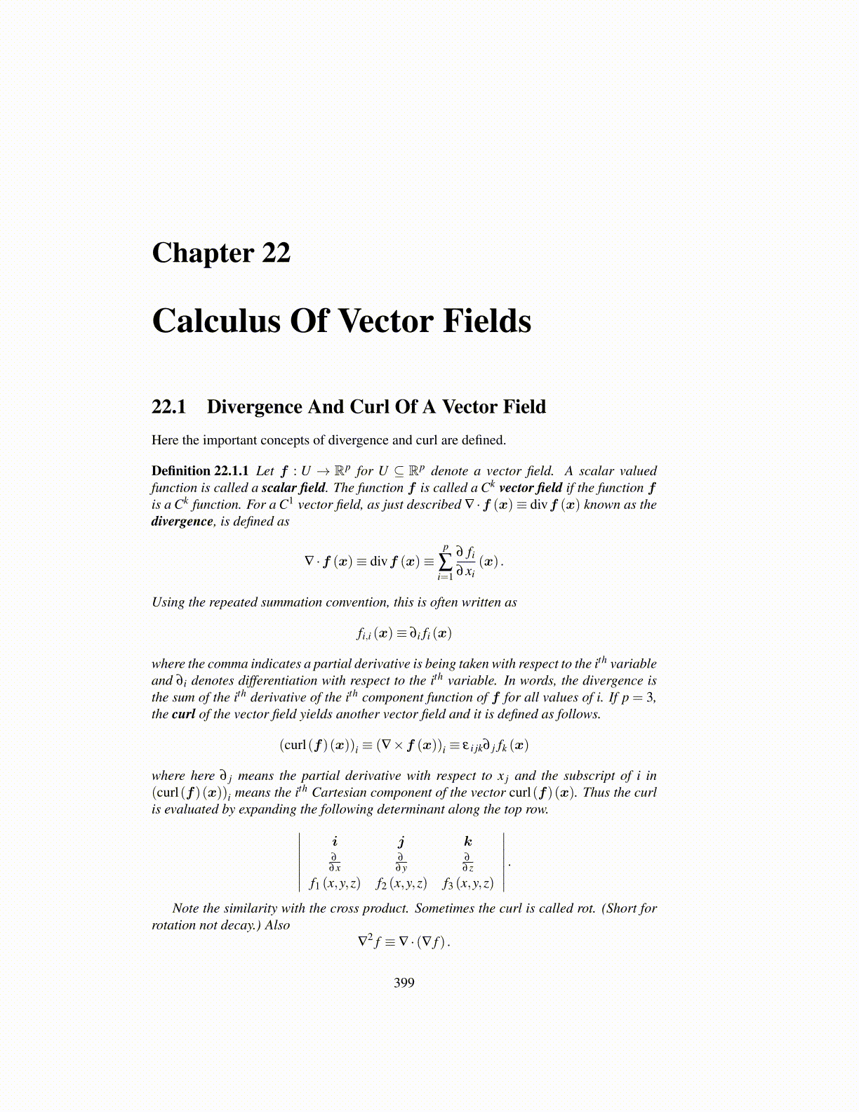 where here ∂ j means the partial derivative with respect to x j and the subscript of i in(curl(f)(x))i means the ith Cartesian component of the vector curl(f)(x). Thus the curlis evaluated by expanding the following determinant along the top row.∣∣∣∣∣∣∣