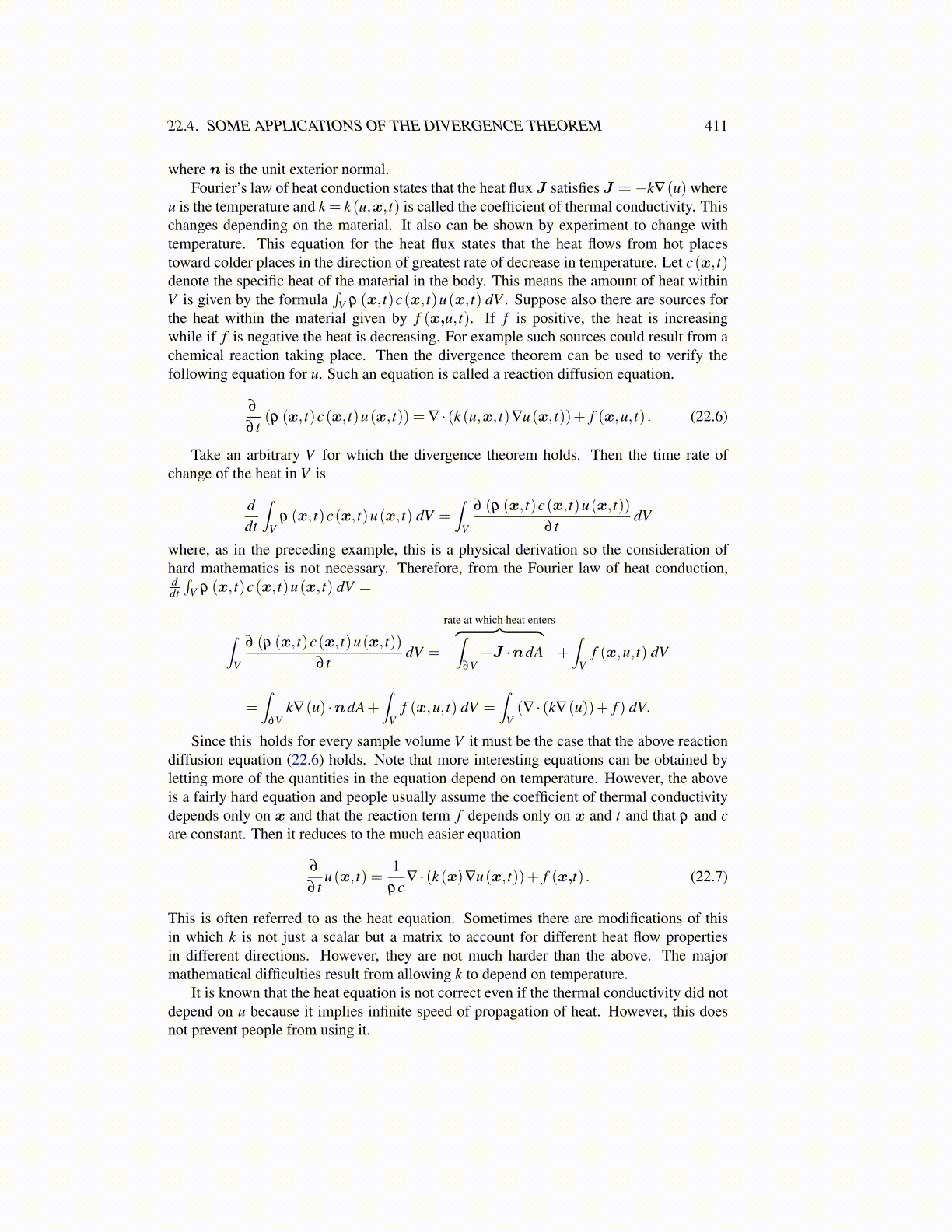 Since this holds for every sample volume V it must be the case that the above reactiondiffusion equation (22.6) holds. Note that more interesting equations can be obtained byletting more of the quantities in the equation depend on temperature. However, the aboveis a fairly hard equation and people usually assume the coefficient of thermal conductivitydepends only on x and that the reaction term f depends only on x and t and that ρ and care constant. Then it reduces to the much easier equation