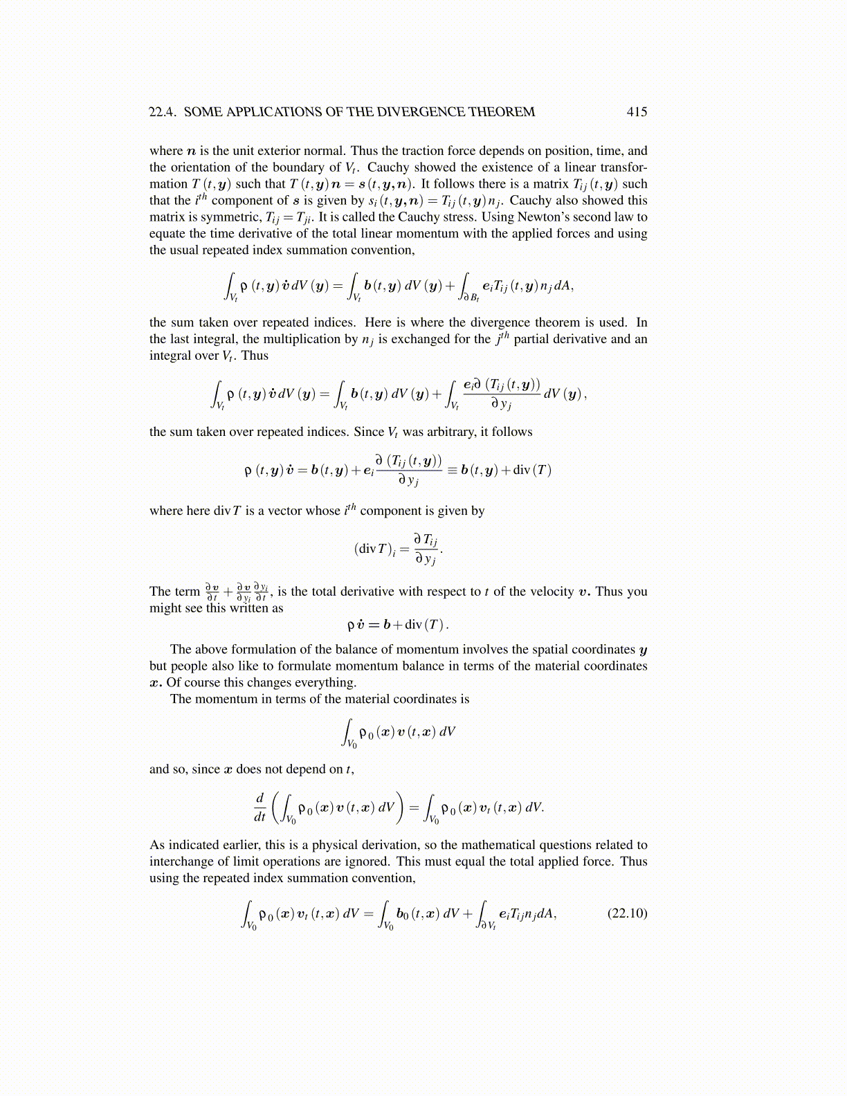 where n is the unit exterior normal. Thus the traction force depends on position, time, andthe orientation of the boundary of Vt . Cauchy showed the existence of a linear transfor-mation T (t,y) such that T (t,y)n = s(t,y,n). It follows there is a matrix Ti j (t,y) suchthat the ith component of s is given by si (t,y,n) = Ti j (t,y)n j. Cauchy also showed thismatrix is symmetric, Ti j = Tji. It is called the Cauchy stress. Using Newton’s second law toequate the time derivative of the total linear momentum with the applied forces and usingthe usual repeated index summation convention,∫