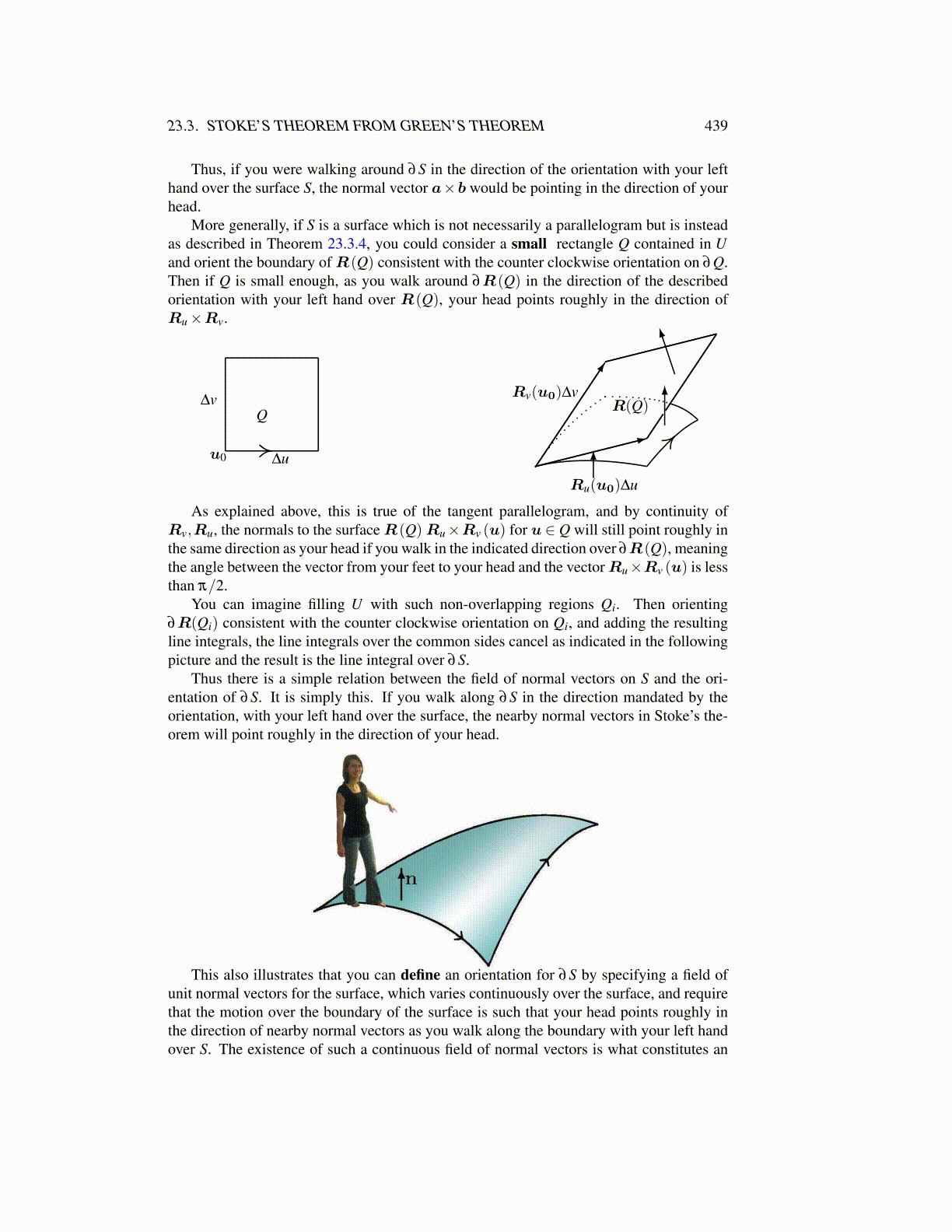 More generally, if S is a surface which is not necessarily a parallelogram but is insteadas described in Theorem 23.3.4, you could consider a small rectangle Q contained in Uand orient the boundary of R(Q) consistent with the counter clockwise orientation on ∂Q.Then if Q is small enough, as you walk around ∂R(Q) in the direction of the describedorientation with your left hand over R(Q), your head points roughly in the direction ofRu×Rv.