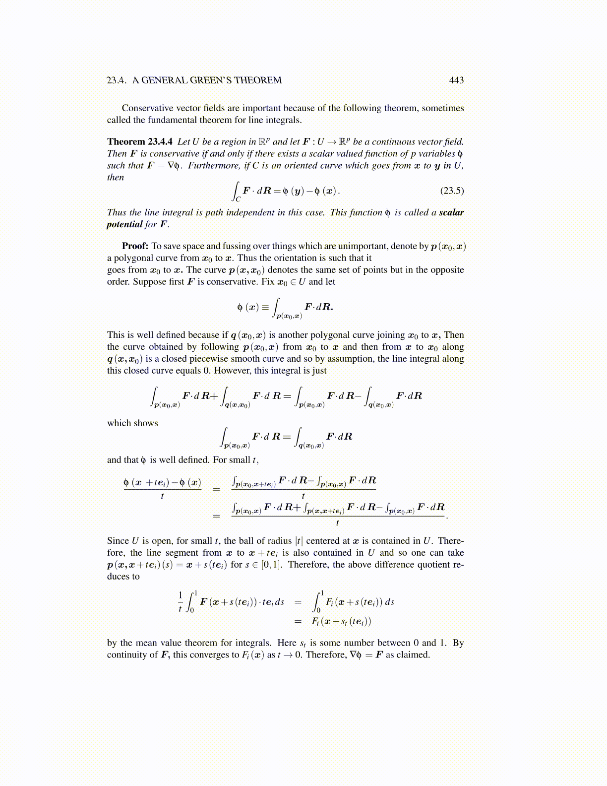 Theorem 23.4.4 Let U be a region in Rp and let F : U →Rp be a continuous vector field.Then F is conservative if and only if there exists a scalar valued function of p variables φ