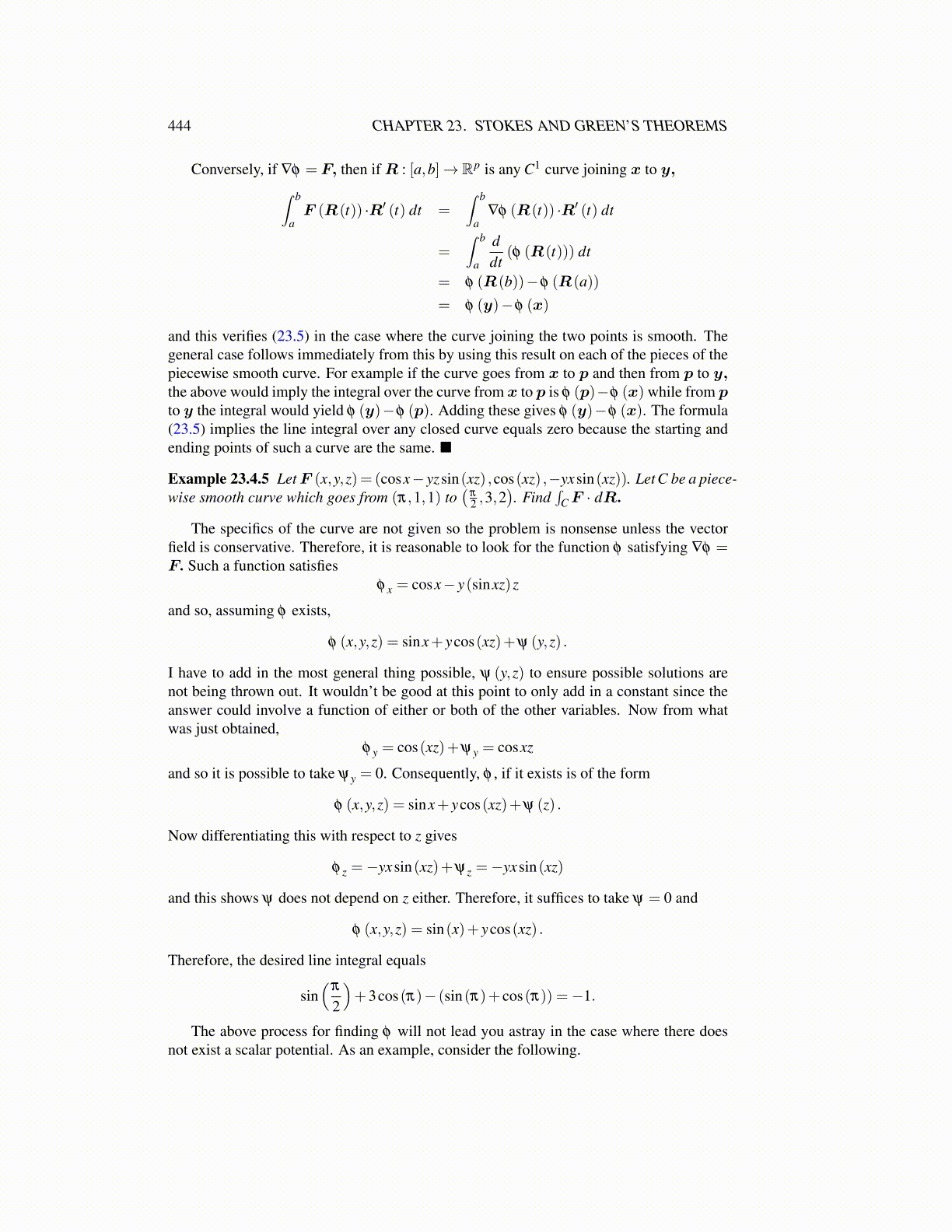 Example 23.4.5 Let F (x,y,z)= (cosx− yzsin(xz) ,cos(xz) ,−yxsin(xz)). Let C be a piece-wise smooth curve which goes from (π,1,1) to