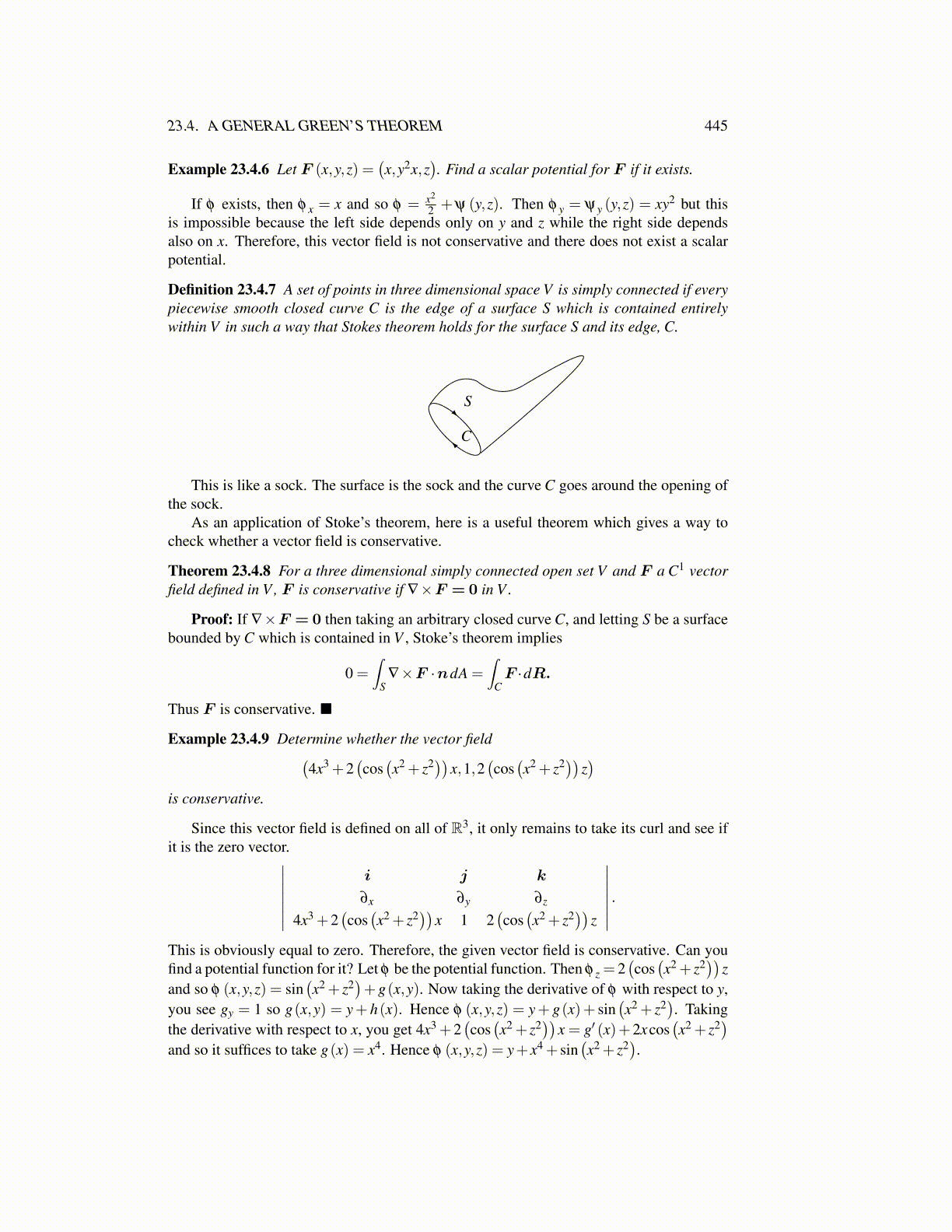 Definition 23.4.7 A set of points in three dimensional space V is simply connected if everypiecewise smooth closed curve C is the edge of a surface S which is contained entirelywithin V in such a way that Stokes theorem holds for the surface S and its edge, C.