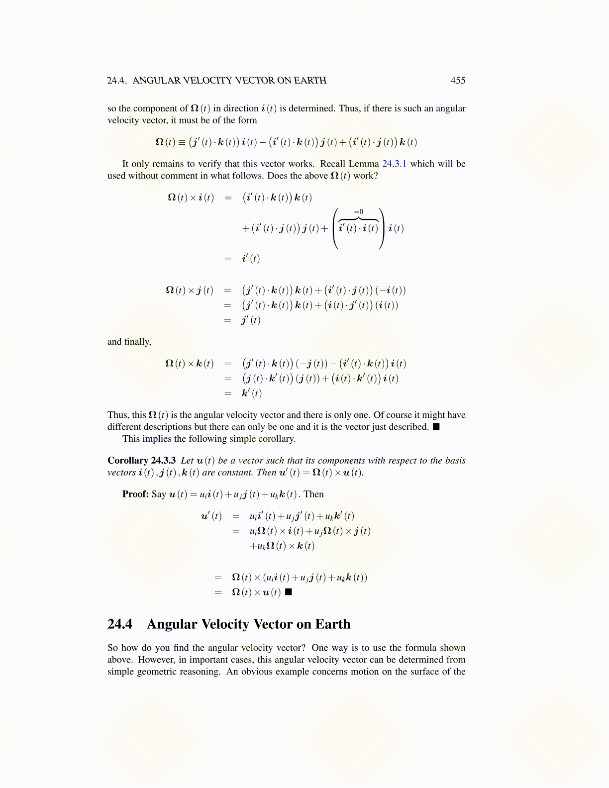 Corollary 24.3.3 Let u(t) be a vector such that its components with respect to the basisvectors i(t) ,j (t) ,k (t) are constant. Then u′ (t) =Ω(t)×u(t).