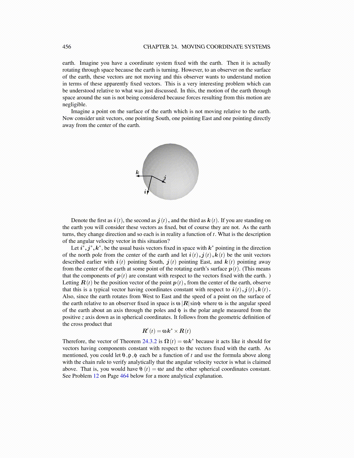 Therefore, the vector of Theorem 24.3.2 is Ω(t) = ωk∗ because it acts like it should forvectors having components constant with respect to the vectors fixed with the earth. Asmentioned, you could let θ ,ρ,φ each be a function of t and use the formula above alongwith the chain rule to verify analytically that the angular velocity vector is what is claimedabove. That is, you would have θ (t) = ωt and the other spherical coordinates constant.See Problem 12 on Page 464 below for a more analytical explanation.